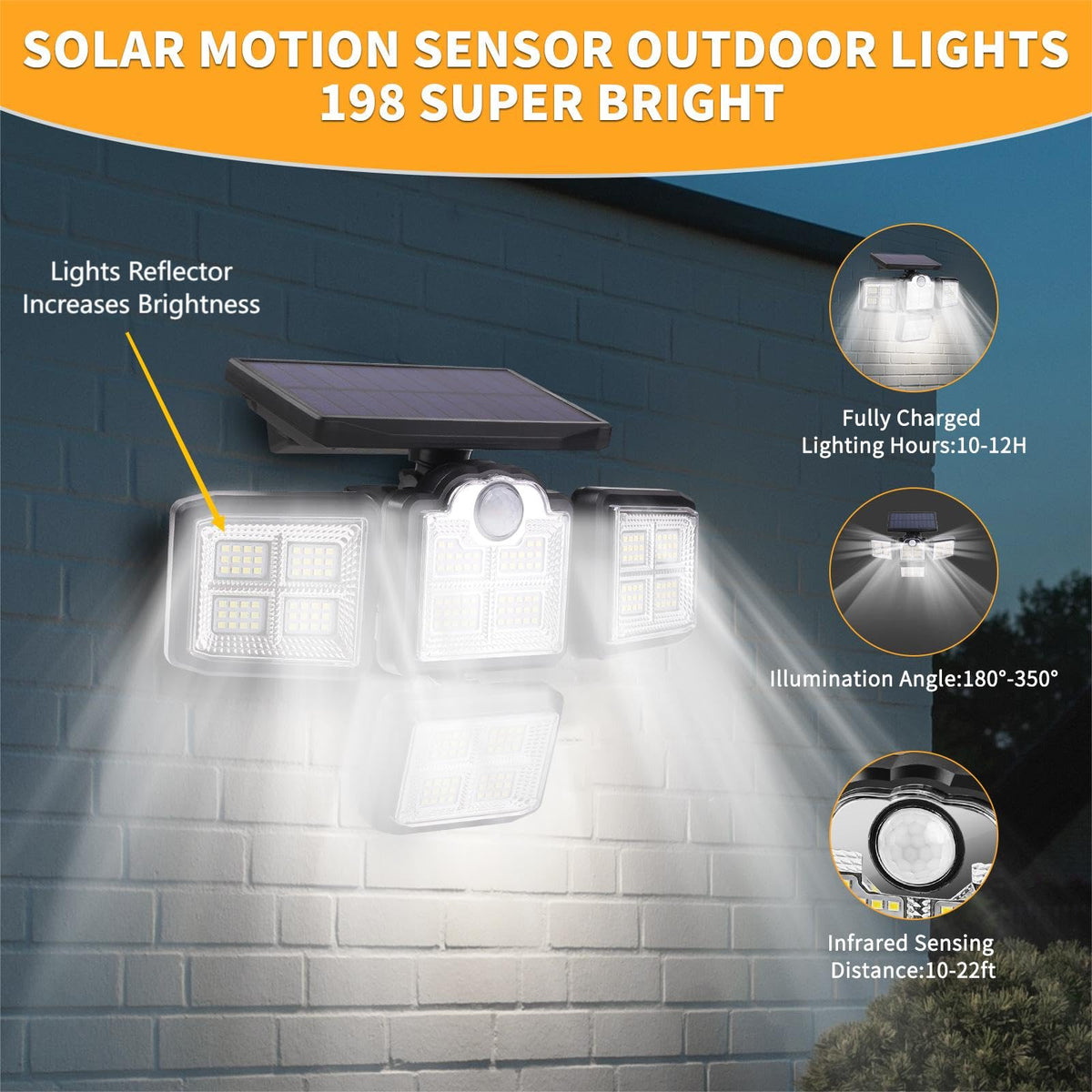 Introducing our high-efficiency solar motion sensor flood light with Lights Reflector, designed to keep your outdoor areas well-lit and secure. It features 198 high-quality LEDs and Equipped lights reflectors that produce a brightness of 6000LM, offering a daylight-like illumination for clear visibility. With a built-in 5.5V, 2W polycrystalline silicon solar panel and a 2800mAh battery, this securety lights can provide consistent illumination for 10-12 hours when fully charged. The light comes with three flexible operation modes that can be easily managed with remote control, meeting different lighting needs. The sensitive infrared sensor, with a range of 3-5 meters, enhances your home's security by accurately detecting movement. Crafted with durable materials and rated IP65 waterproof, our light can withstand various weather conditions, ensuring a long lifespan. Illuminate and secure your space with our energy-efficient solar security light.