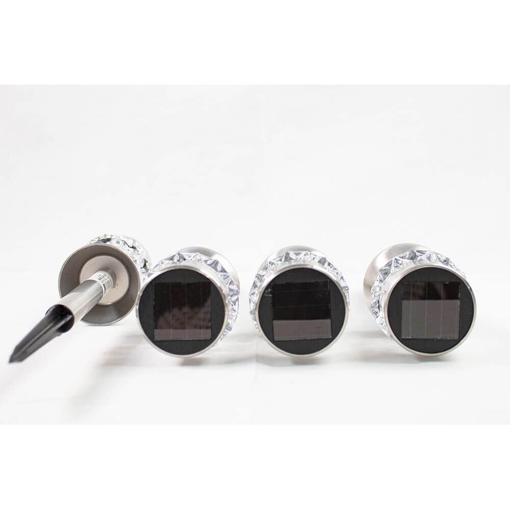 Add a charming, decorative glow to your driveway, patio or flowerbeds with this Crystal Effect Solar Power Garden Light featuring a transparent LED light with a faceted clear cover and brushed silver metal shell. Lights turn on automatically at dusk and have stakes that can be easily inserted into the ground. No batteries or wiring needed - installs in seconds. Light includes a solar panel and rechargeable battery. Each light measures approximately 9 tall with a 4 long stake. Countertop display comes with 12 pieces.,Crystal Effect Solar Power Garden Light Countertop Display