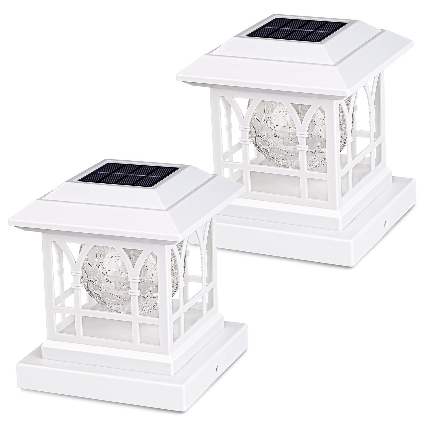 Aefreleoht Solar Post Cap Lights, Warm White & Rgb Automatic Cycling, Cracked Glass Bulb, 20 Lumens Lp65 Waterproof Fit 3.6X3.6 4X4 4.5X4.5 5X5 Wood Fence Post Solar Powered Lights White (2 Pack)