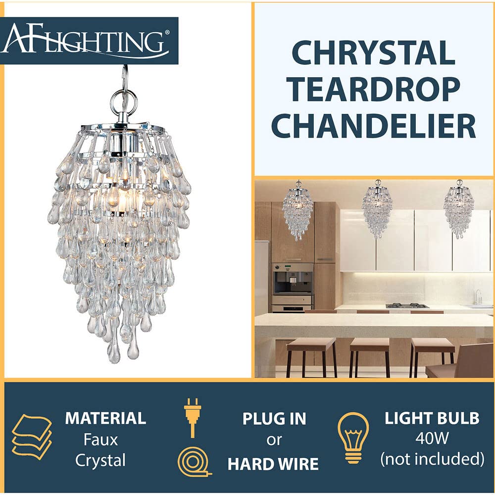 AF Lighting Chrystal Teardrop Pendant Light with Swag Kit, Clear Glass Drop Beads, and Chrome Finish for Plug-In or Hardwire Ins