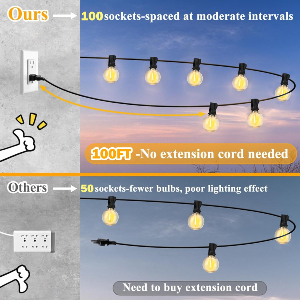 - **100FT Length with 105 Bulbs**: This extensive string light setup includes 100 feet of durable wire with 105 G40 Edison bulbs, providing ample lighting for patios, gardens, and event venues.