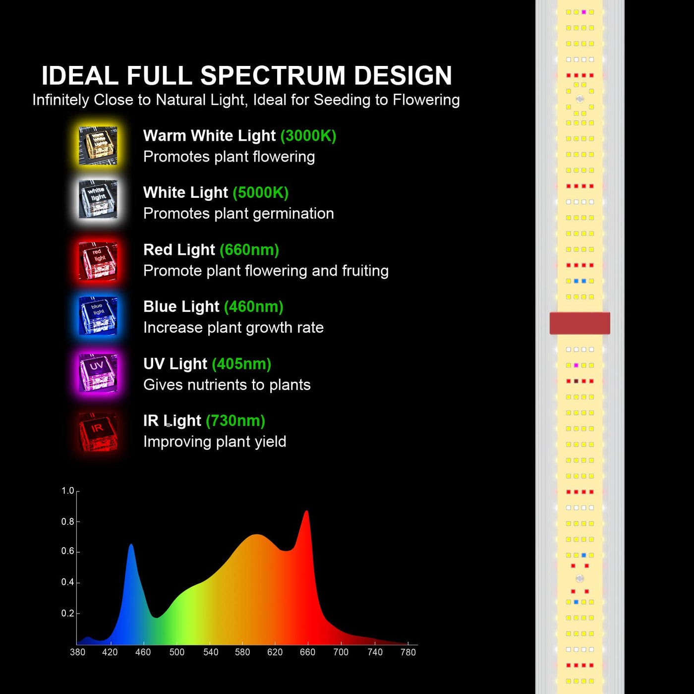 The 650w led grow light consists of full spectrum Warm White3000K, Cool White 5000K, Blue 460nm, Red 660nm, UV 405nm and IR 730nm, providing plants at all stages from veg to flower with everything they need in the natural sunlight, making your plants healthier and happier.