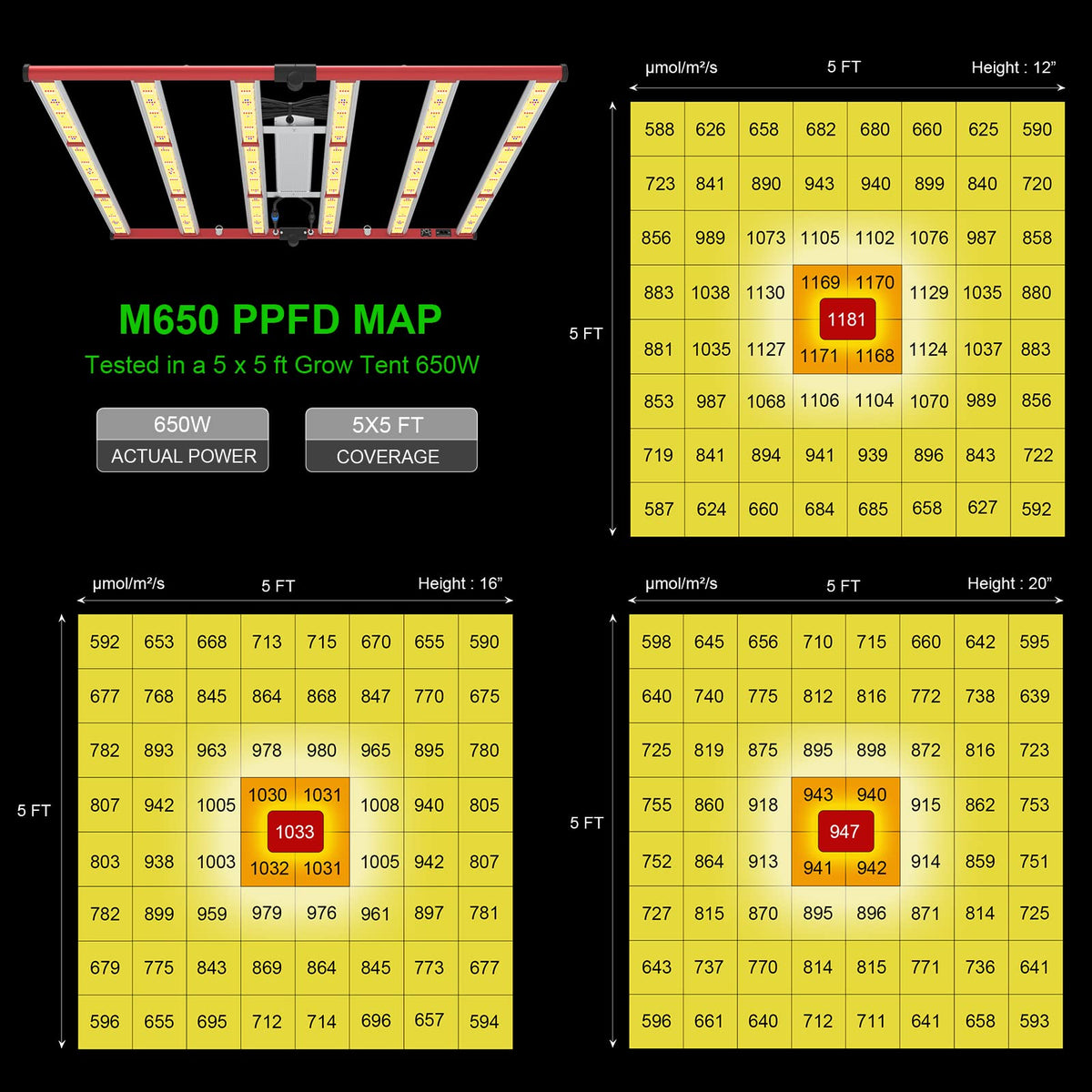 Q: What is the coverage area of the AGLEX 650W LED Grow Light?A: The AGLEX 650W LED Grow Light provides perfect coverage for a 5x5ft area when hung at a height of 16 inches, making it suitable for various indoor plants.