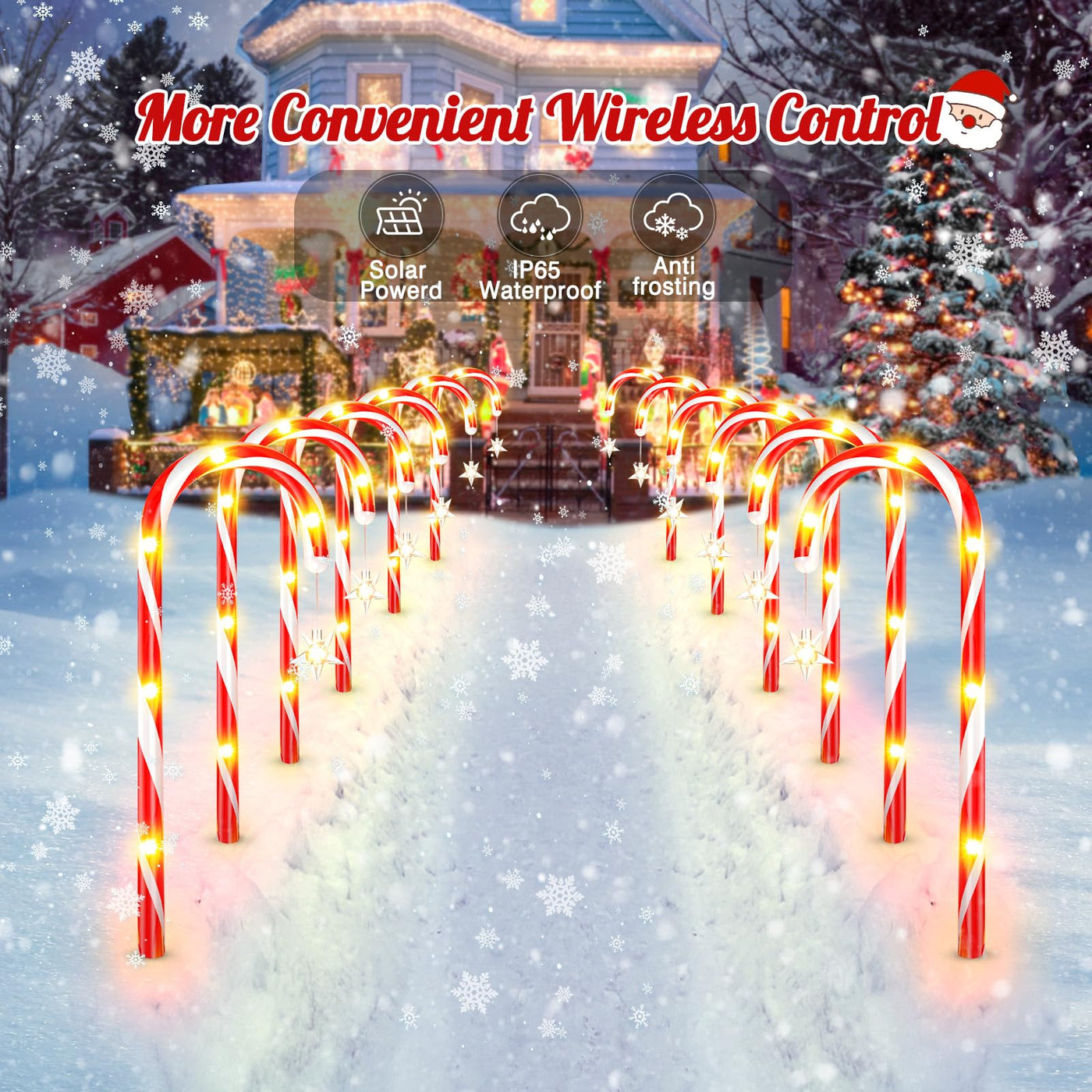Q: What are the different lighting modes available for these solar lights?A: The solar candy cane lights feature 10 different lighting modes, including Auto Cycle, Breath Strobe, Combination Strobe, Blinking, Twinkling, and Always On, allowing you to choose the perfect ambiance for your outdoor Christmas decorations.