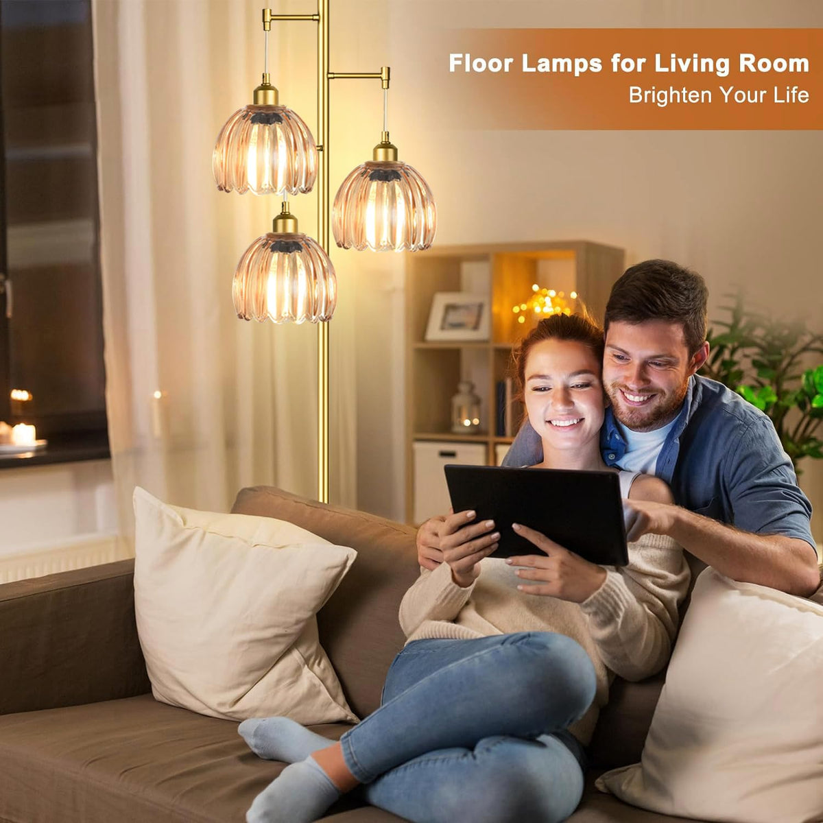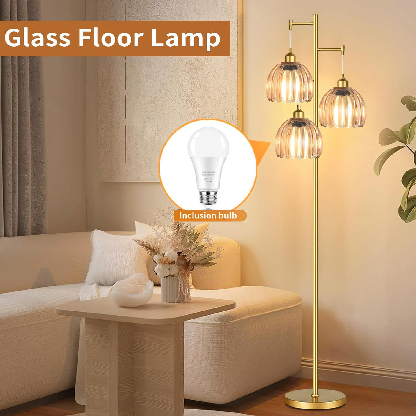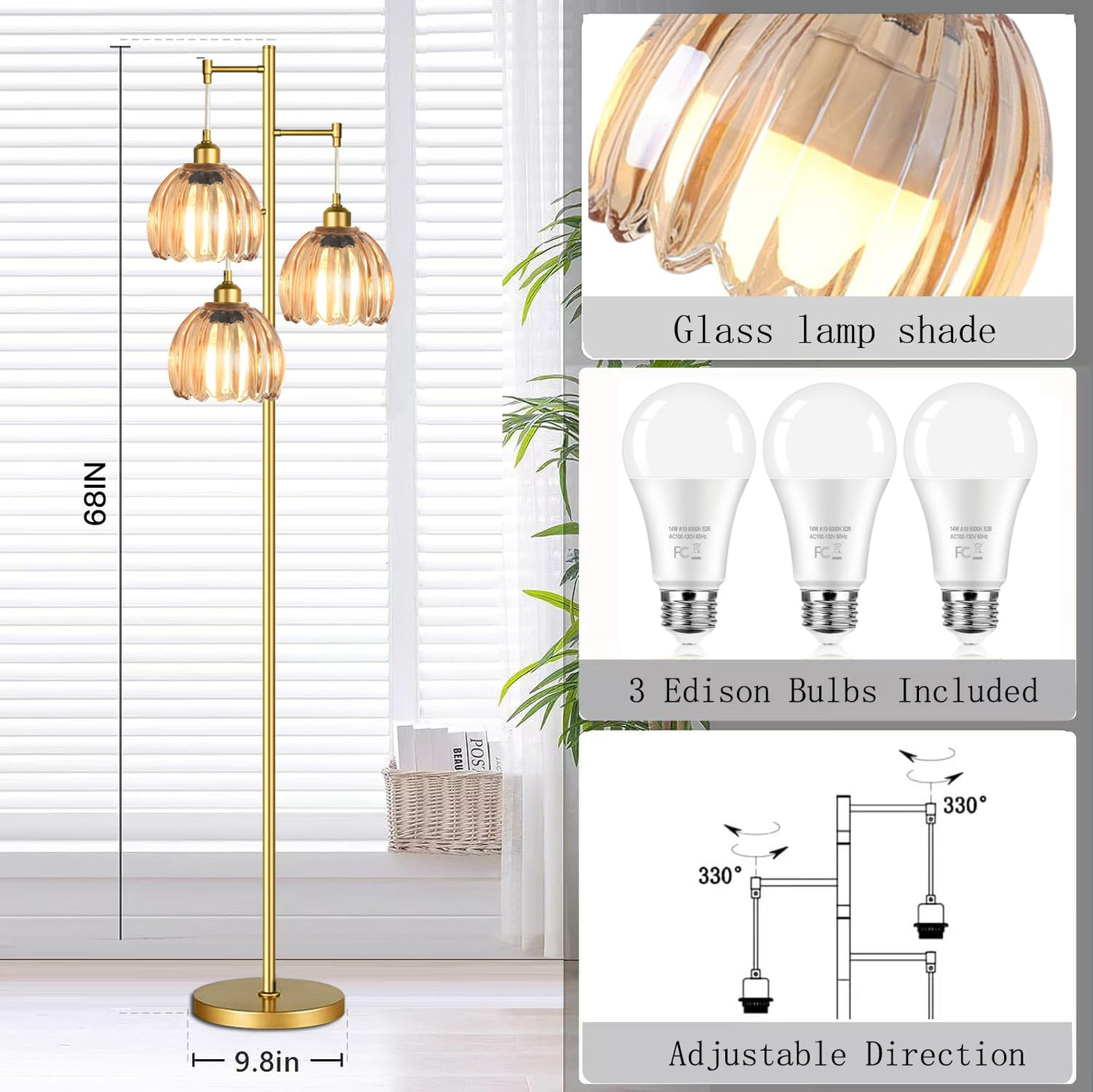 Ahdwdw Gold Floor Lamp For Living Room Bedroom,3 Lights Mid Century Modern Floor Lamps With Flower Glass Shades,68In Tall Standi