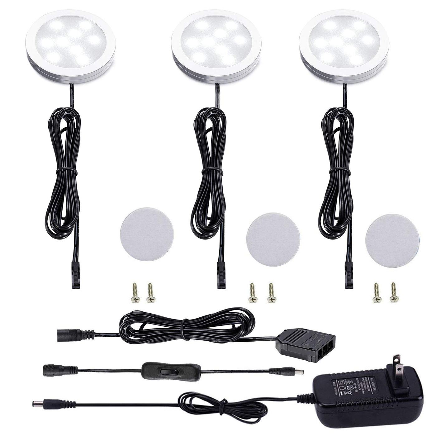 Aiboo 12V Led Under Cabinet Lighting Kit 3 Packs Slim Aluminum Puck Lights With 2-Way Switch All Accessories Included For Counter Closet Lighting 6W (Daylight White)