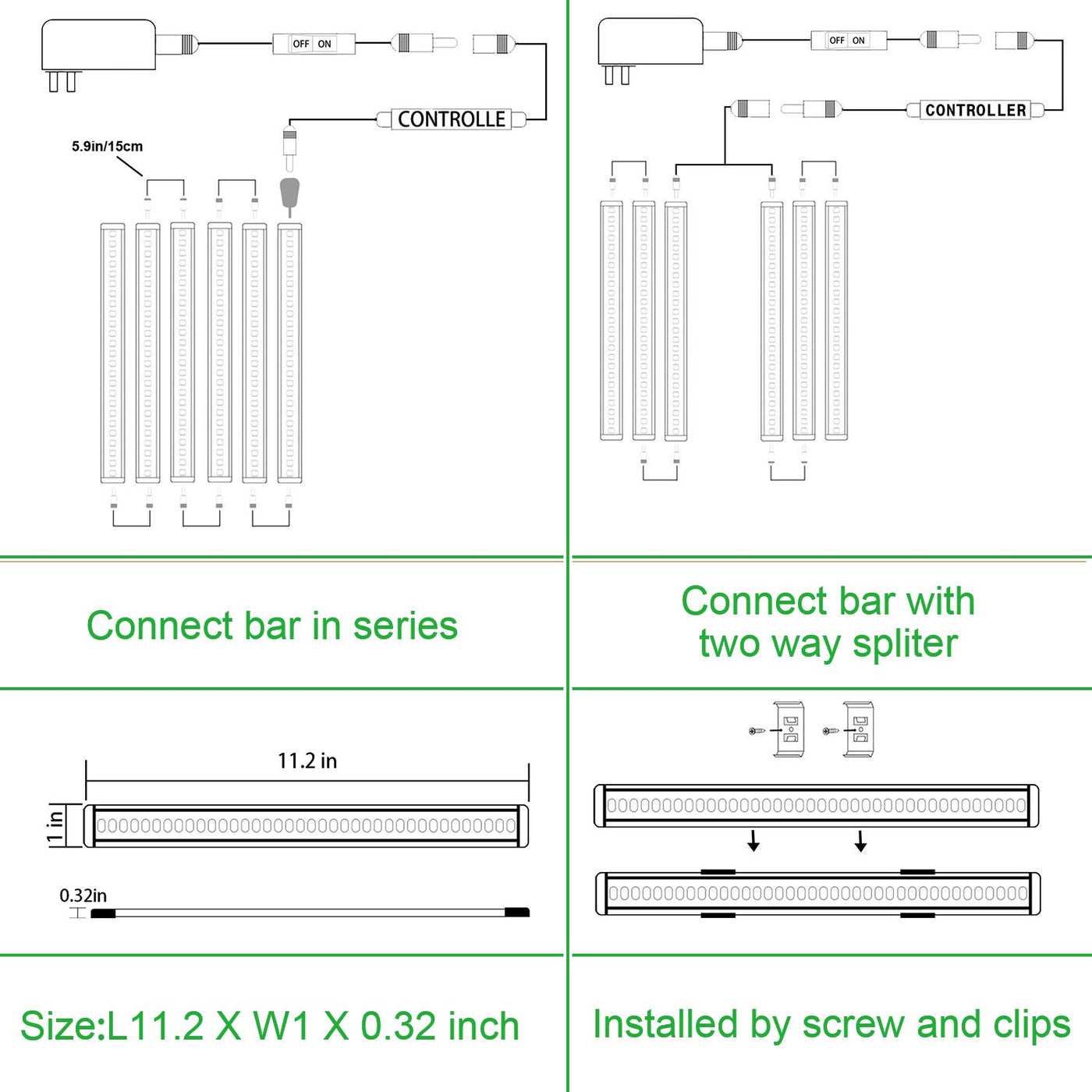 This is a set of bright LED under cabinet rigid light bar kit with dimmable switch, widely use as above cabinet lightng,shelf lighting,counter top lighting, task lighting etc. @ SPEC: Color Option: Warm white(2700K). Energy Saving: 3W, equal to 30W halogen, incandescent or fluorescent kitchen light. Lumen : 300 lumen per panel bar CRI: >80 Size: Length:11 inch, Width:1 inch,Thickness:0.32inch Inter connect cable: 5.9 inch / 20 inch, Power Adapter: 80 inch, Power Adapter Connector: 12 inch Material: Aluminum alloy @ FEATURES: SAFE TO USE: UL listed power plug, 12Vdc output. EASY TO INSTALL: You can either use 3M adhesive tapes or screws to install in wherever it fits. ENERGY SAVING: 3W LED is to replace 30W halogen led under cabinet lights, >90% electricity bill saving. LOW PROFILE KITCHEN LIGHT BAR: Only 0.32 inch of thickness, it is almost invisible after installing the slim under or above cabinet lights. DIMMABLE: By using a dial dimmer switch, the under cabinet rigid bar lights can be used for dimming from 0% to 100%. Plus there is another On/Off switch inline with the transformer, dimming function can be remembered, you can have the same brightness next time when the cabinet light bar turned on FLEXIBLE TO CONNECT: There are 2 different connection cables included, one is 5.9 inch, the other is 20 inch. Therefore the under cabinet lights can be connected according to different distance. @ PACKAGE INCLUDED: 6 x LED under cabinet rigid bar light 1 x power wall plug 1 x dial dimmer switch 1 x DC connector 5 x connection cable (5.9 inch) 4 x connection cable (20 inch) 12 x double sided adhesive stickers 12 x screw mounting buckle 12 x screw 8 x cable arrangement buckle @ REMOTE CONTROL: Need a RF remote control, please refer to the ASIN #B01M7TGZ9B, extension cables please refer to ASIN B07J5XP2D3.