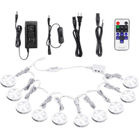Linkable Under Cabinet LED Puck Lights Kit Wall Plug In & Hard Wired Wireless RF Remote Control for Kitchen Counter Closet Accent Lighting @ 2-WAY INSTALLTIONS There can be 2 ways of installations: 1) Wall plug in. 2) Hardwired. The user can easily choose one way to install according to the requirement. @ LINKABLE CONNECTION This creative design of LED under cabinet lighting kit is different from most under cabinet lights which normally use a distributor to achieve parallel connections. This set of cabinet led lights can be linkable, can be connected in both ways: series connection and parallel connections. @ DIMMABLE With a 12V mini RF remote controller, the lights can be easily turned on and off and dimming from 0% to 100%. @ INVISIBLE Low profile aluminum alloy thin puck led lights shell which makes the puck light kit can hardly been inspected after installation until turned on. @ MULTI-FUNCTIONAL PUCK LIGHTING USAGE Suitable for household and residential application like kitchen, under counter, closet, wardrobes, cupboards, dresser, wall, ceiling, cabinet, desk, bed, table, drinks(liquor) cabinet, wine racks, wine cellars, bar counter, TV cabinets, china cabinets, furniture etc. @ SAFE AND SECURE UL listed power adapter, 100-240Vac input, 12Vdc output, safe for touching. @ PACKAGE INCLUDED 10 x 12V LED under cabinet puck light 1 x LED hardwired transformer with wall plug in (AC120 to DC12V) 1 x Distributor 1 x Wireless RF remote controller (including a receiver and a remote) 4 x Extension cable (5ft) 10 x double adhesive sticker 20 x Screw @ EXTENSION CABLE Should you need more extension cords, please refer to the ASIN #B06XG7J9W2. @ REMOTE CONTROL Should you need extra remote control sets, please refer to the ASIN #B01M7TGZ9B.