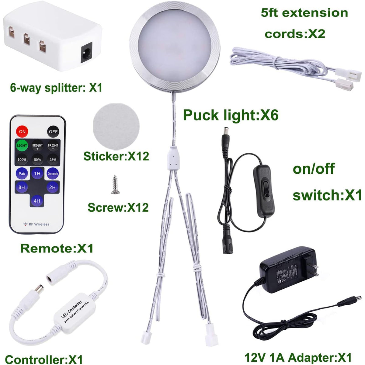 Linkable Under Cabinet Led Puck Lights Kit Wall Plug In Wireless Rf Remote Control For Kitchen Counter Closet Accent Lighting @ Linkable Connection This Creative Design Of Led Under Cabinet Lighting Kit Is Different From Most Under Cabinet Lights Kit Which Normally Use A Distributor To Achieve Parallel Connections. This Set Of Lights Can Be Self Linking, Can Be Connected In Both Ways: Series Connection And Parallel Connections. @ Dimmable With A 12V Mini Rf Remote Controller, The Lights Can Be Easily Turned On And Off And Dimming From 0% To 100%. @ Invisible Low Profile Aluminum Alloy Puck Shell Which Makes The Puck Light Can Hardly Been Inspected After Installation Until Turned On. @ Multi-Functional Usage Widely Use As Under Or Above Cabinet Lighting, Gun Safe Light, Worktop Lights, Rv Cabinet Light, Medicine Cabinet Lights, Cabinet Display Lights, Floating Shelf Light,Under Counter Lights Etc. @ Energy Saving Each Led Puck Light = 25W Fluorescent Puck Light Replacement, Over 90% Energy Saving. @ Safe And Secure Ul Listed Power Adapter, 110Vac Input, 12Vdc Output, Safe For Touching. @ Package Included 6 X 12V Led Under Cabinet Puck Light 1 X Led Transformer Wall Plug In (Ac110 To Dc12V) 1 X Distributor 1 X Wireless Rf Remote Controller (Including A Receiver And A Remote) 2 X Extension Cable (5Ft) 6 X Double Adhesive Sticker 12 X Screw @ Extension Cable Should You Need More Extension Cords, Please Refer To The Asin #B06Xg7J9W2. @ Remote Control: Should You Need Extra Remote Control Sets, Please Refer To The Asin #B01M7Tgz9B.