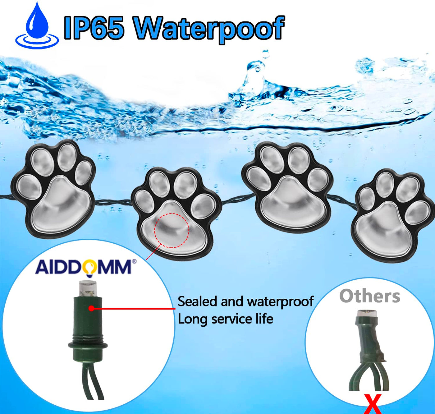 Q: Are the AIDDOMM Paw Print Solar Lights waterproof?A: Yes, these solar lights have an IP65 waterproof rating, ensuring they can withstand rain and outdoor conditions without damage.
