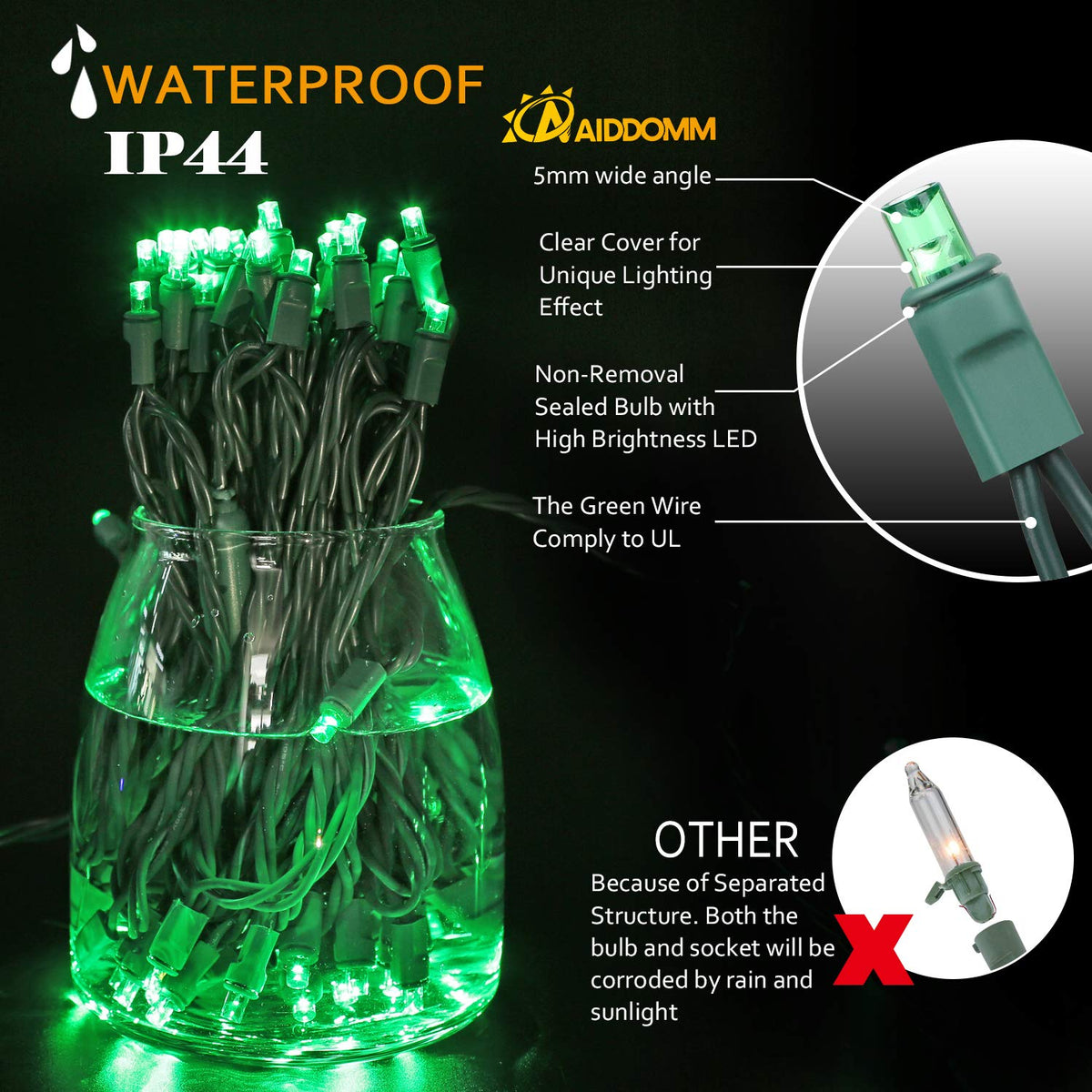 Q: What type of bulb does the AIDDOMM Green LED Christmas Lights use?A: The lights use non-removable, mini LED bulbs that are designed to be durable and resistant to moisture.