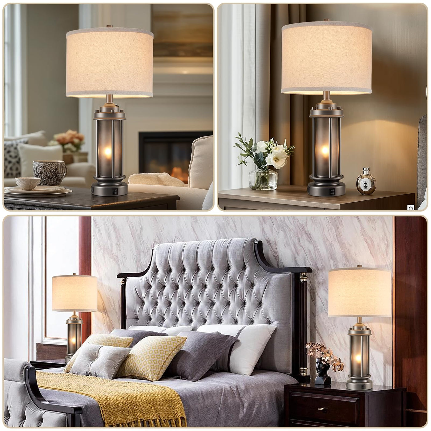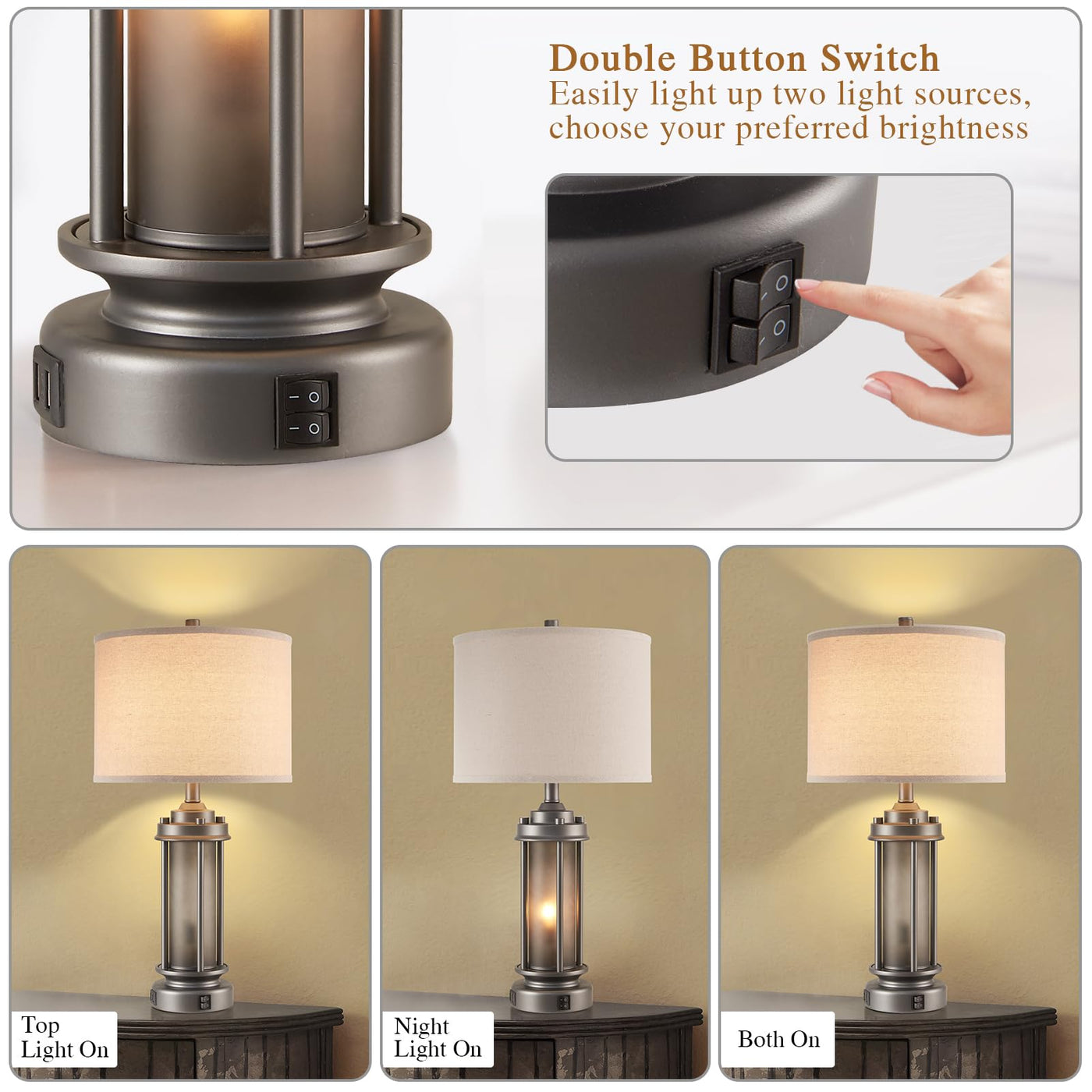 This classic vintage industrial table lamp set of two is made of vintage grey metal with frosted glass night light and linen fabric shade. The clever combination of the grey metal stand and the frosted glass night light displays a warm and elegant texture, creating a warm and cozy home atmosphere. Whether placed in a bedroom, living room, den or entryway, these table lamps blend in perfectly with vintage, rustic, traditional, industrial and other home styles and are a great accent to home decor. AIEAMPDO Table Lamps Meet Your Needs! Equipped with a dual button switch and two USB charging ports for easy control of lights and charging devices. It also comes with 4 bulbs, A19/5W-2700K small bulb and C7/7W small bulb, no need to buy compatible bulbs.AIEAMPDO Living Room Table Lamp is both practical and beautiful, meet your multiple needs. Premium Quality Our table lamps are equipped with high quality heavy duty metal bases and advanced anti-slip pads to ensure that they are super stable and safe to use. The lampshade is made of high quality linen, providing a soft and warm glow for a cozy atmosphere. The base is sturdy and durable, providing a stable foundation for the table lamp. If you are looking for a table lamp that is not only beautiful but also durable, our vintage table lamps are a top choice. Classic Vintage Design with Perfect Decoration Incorporating classic elements, the combination of a grey metal stand and an frosted glass shade makes this table lamp both vintage and elegant, and effectively shades out the light at night, adding a touch of warmth and comfort to your home environment. Convenient Installation< br > All accessories are included in the package for you to assemble. Follow the instructions and you will assemble it in minutes and get a stunning table lamp that saves a lot of time and effort!