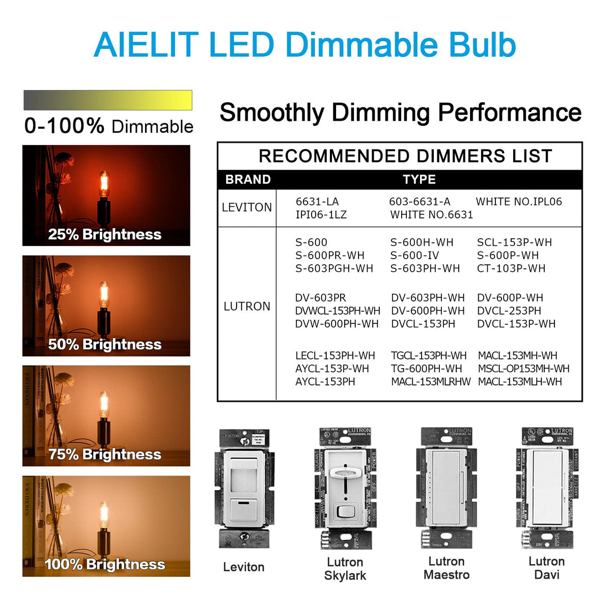 We are always looking for the Edison led light bulbs dimmable with flicker-free, especially those that seem to offer a better way of combining vintage elegance with the durability, versatility and functionality needed for chandeliers, wall sconces, pendant lighting or home decoration. This T8 filament bulb from AIELIT fits that bill. AIELIT T8 LED Filament Bulb Dimmable: Smoothly from 0 to 100% Base: Screw E12 candelabra base Rated Power: 4W (40W equivalent) Brightness: 400 lm CRI (Color Rendering Index): 85+ Color Temperature: Warm white 2700K Lifespan: Average 25000 hours Input Voltage: AC 110V - 130V Multi-Application Adopted newest LED technology, no glare, no flicker, applied widely for ceiling fan, chandelier, enclosed fixture, lamp, and decorative lighting, suitable for all small E12 standard candelabra base fixtures, perfect for hallway, porch, foyer, kitchen, living room, dining room, bedroom, hotel, schools, museum, shopping malls, supermarkets, restaurants, enjoying a good moment with the warm white glow light. Easy to screw in. Note: Power off before install. Recommended Dimmers ListCompatible with LUTRON: S-600, S-600PR-WH, S-603PGH-WH, S-600H-WH, S-10PH, SCL-153P-WH, S-600P-WH, S-600-IV, S-603PH-WH, SCL-153PH-WH, DV-603PR, DVWCL-153PH-WH, DVW-600PH-WH, DV-603PH-WH, DV-600PH-WH, DVCL-153PH, DV-600P-WH, DVCL-253PH, DVCL-153P-WH, DVCL-153P-WH-3 TG-600PH-WH, TG-600PH-IV, TGCL-153PH-WH, TG-603PGH-WH,AYCL-153P-WH, CT-103P-WH, MACL-153MH-WH, MSCL-OP153MH-WH, MACL-153MLH-WH, LECL-153PH-WHCompatible with LEVITON: 6631-LA, LIGHT ALMOND NO.6672, 603-6631-A, WHITE NO.IPL06, IPI06-1LZ, WHITE NO.6631 What You Get AIELIT 4-Pack 4W T8 dimmable LED filament bulb, our worry-free 24-month warranty and friendly customer service. Note: Any quality issues or need guidance, pls email us. We will process and reply within 12 hours.