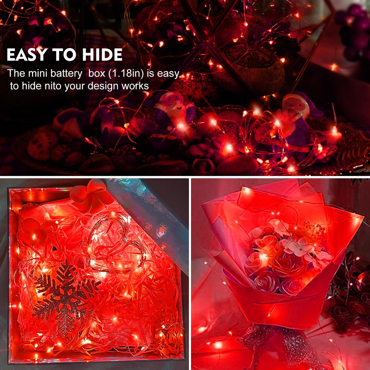 Q: Can I bend the copper wire of the fairy lights for different decorations?A: Absolutely! The flexible copper wire allows you to easily bend and shape the fairy lights, making them perfect for various decorations such as around trees, flowers, or gift boxes.