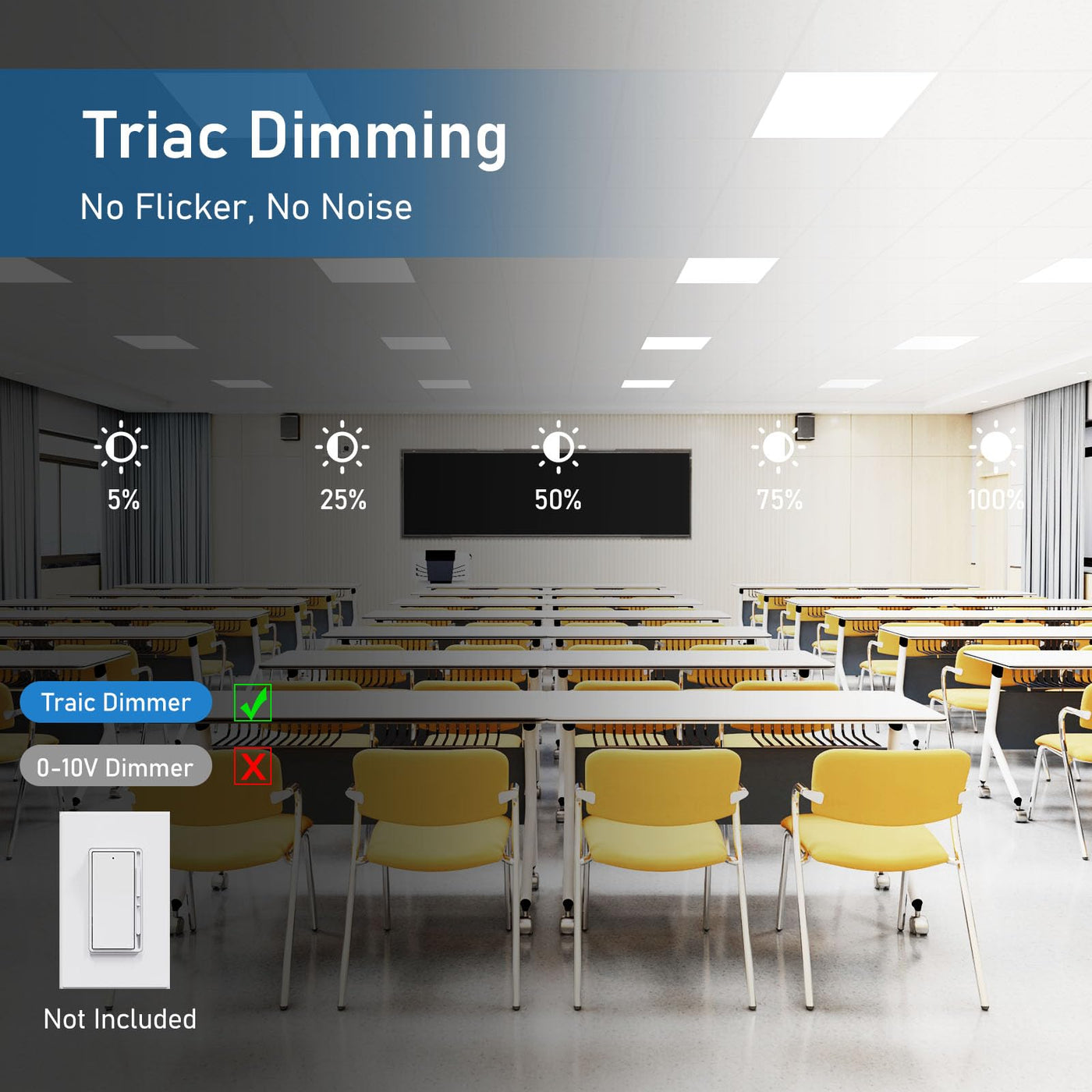 - **Triac Dimmable Functionality**: Enjoy seamless brightness adjustments from 5% to 100% with compatible triac dimmers. This allows for smooth transitions in lighting without flickering or buzzing, ensuring a comfortable and uniform light output, perfect for meeting rooms or lecture halls.