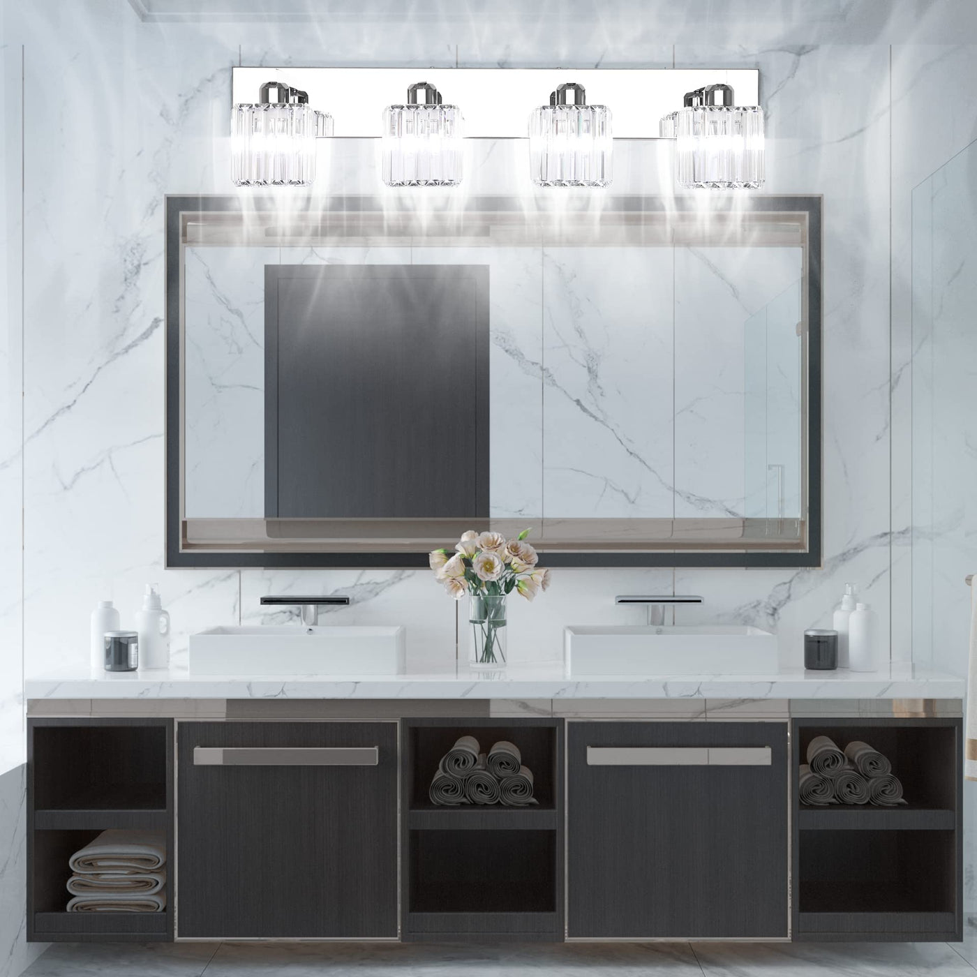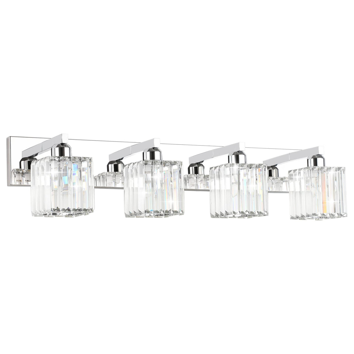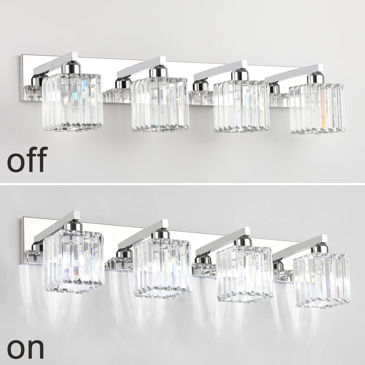 SPECIFICATION:Length 32.3 inch*width 7.2 inch,7.3inch extend from the wall. The dimensions of the vanity light fixture backplate are: length 32.3inch x width4.7inch. | E26 SOCKET & DIMMABLE: This vanity light is compatible with E26 bulbs.It is recommended to use E26 bulbs with length less than 4.7 inch. This vanity light fixture can be dimmed if you install the dimmable bulbs.(Not included Bulbs) | HIGH-QUALITY MATERIALS:The materials of this crystal vanity light are:Stainless Steel ,Crystal. The mirror gloss finishing stainless steel makes the metal not easy to be corroded and aged. It can be as good as new in any time.The gorgeous crystal creates a beautiful lighting effect and brings more brilliance to your life. The crystal lampshades can be taken off for cleaning. | EASY TO INSTALL: The chrome vanity light needs to be simply assembled. There is no switch or plug on this bathroom light fixture.(You need to prepare a switch.) | SINCERE SERVICE:If there is any problem with this crystal vanity light, please feel free to contact us to provide you with a solution. We will try our best to provide you with a high-quality shopping experience. Please shop with confidence!