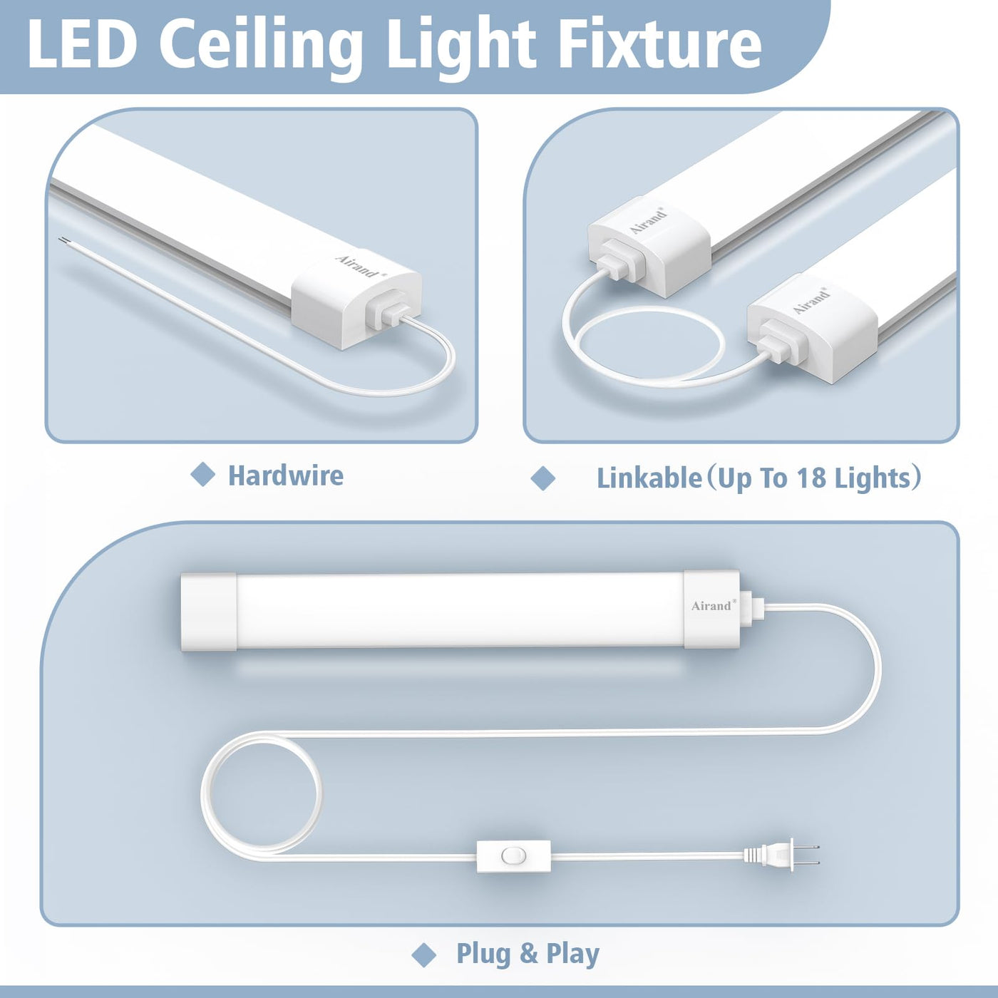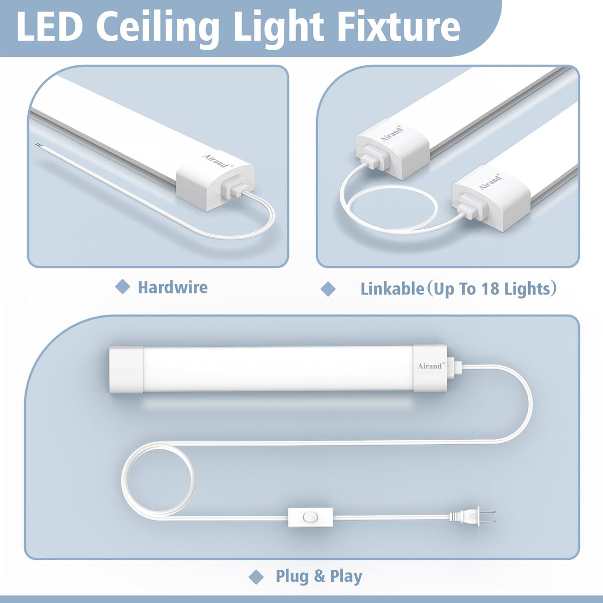 Q: Can I link multiple Airand LED Tube Lights together?A: Yes, the Airand LED Tube Lights are linkable, allowing you to connect up to 18 fixtures together using the included 19.6-inch connector cords. This feature makes it easy to create a custom lighting solution for larger areas.