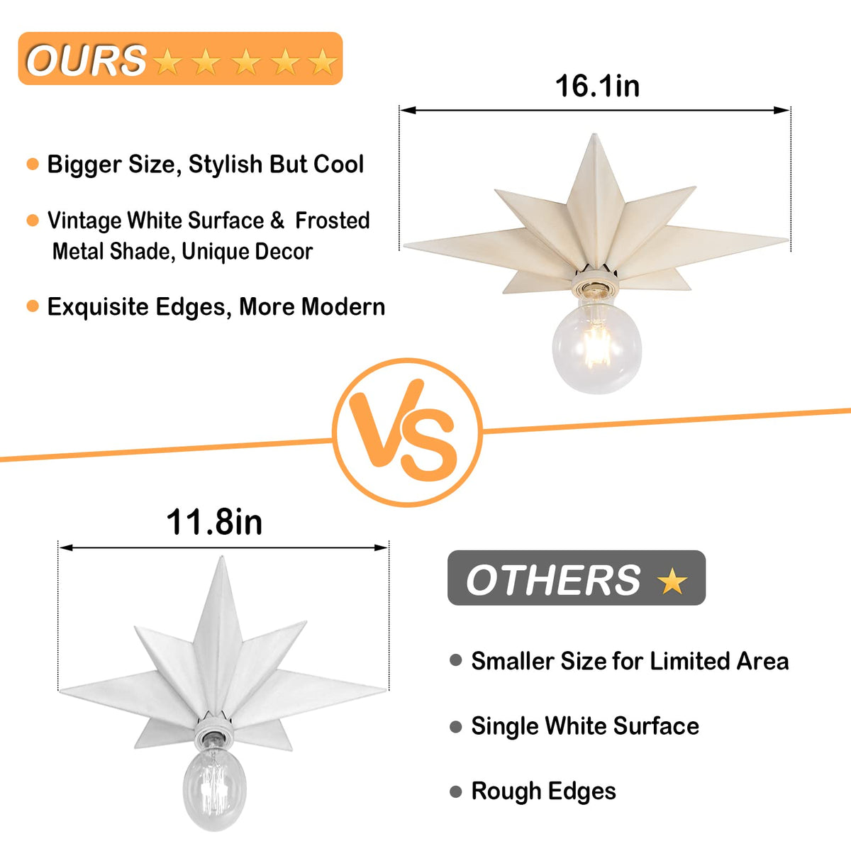Enhance your home lighting with the Vintage Metal Flush Mount Ceiling Light featuring a unique Farmhouse White star shape design. This versatile fixture serves as both a ceiling light and a wall lamp, making it an excellent choice for various spaces in your home.