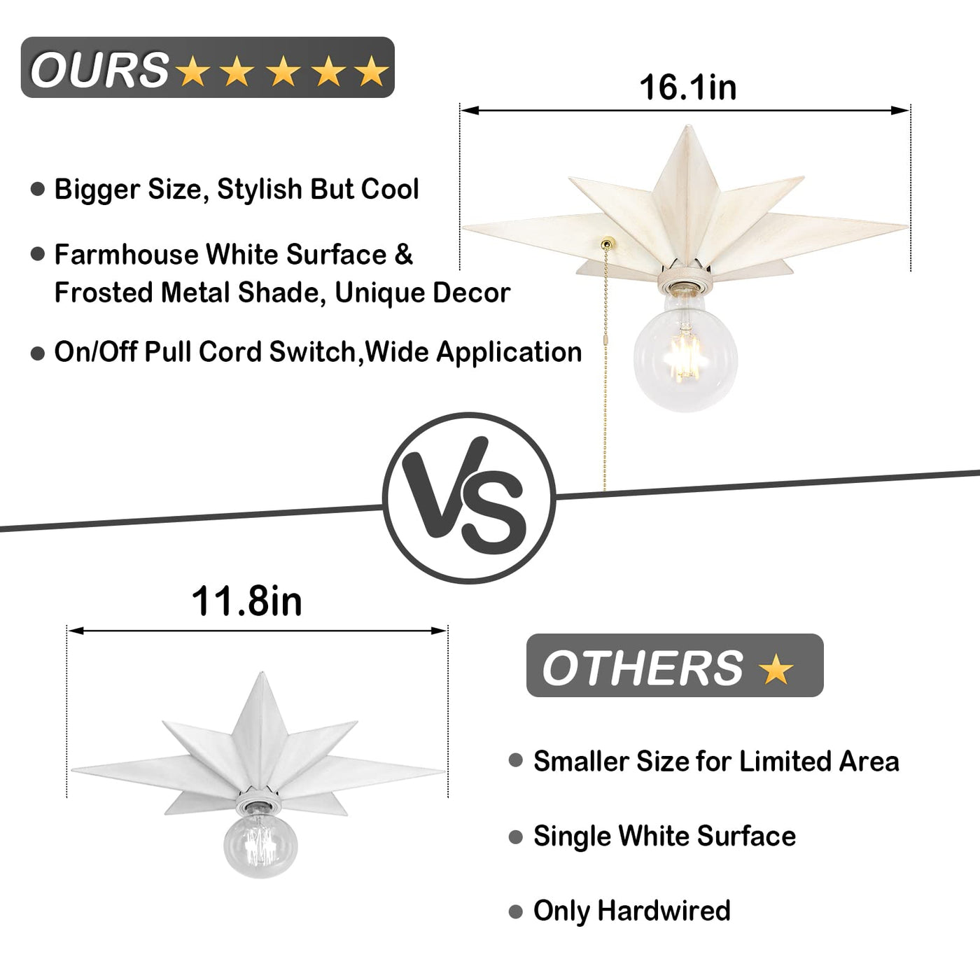 Airposta 16 inch Flush Mount Ceiling Light, White Star Design, Metal, Pull Chain, Farmhouse Style for Hallway, Entryway, and More