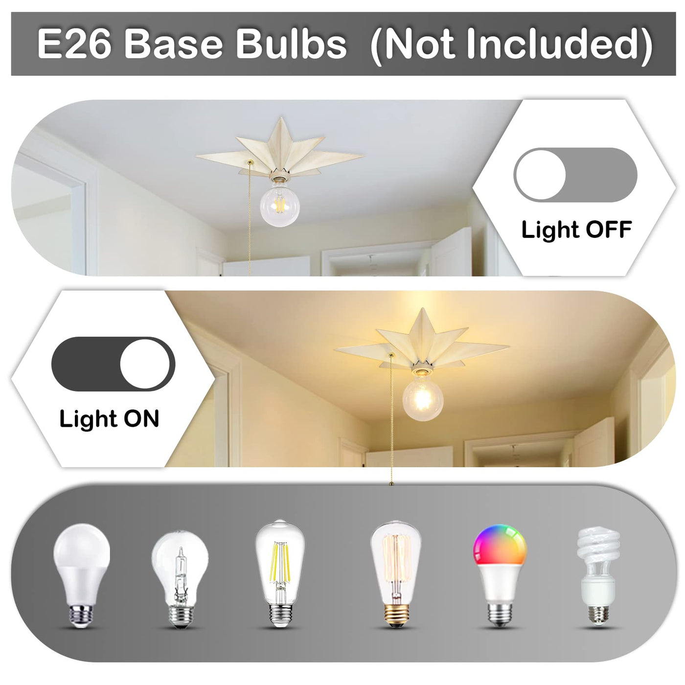 Compatible with UL Listed E26 sockets (Max 60W), suitable for incandescent, LED, CFL, and halogen bulbs (Bulb Not Included).