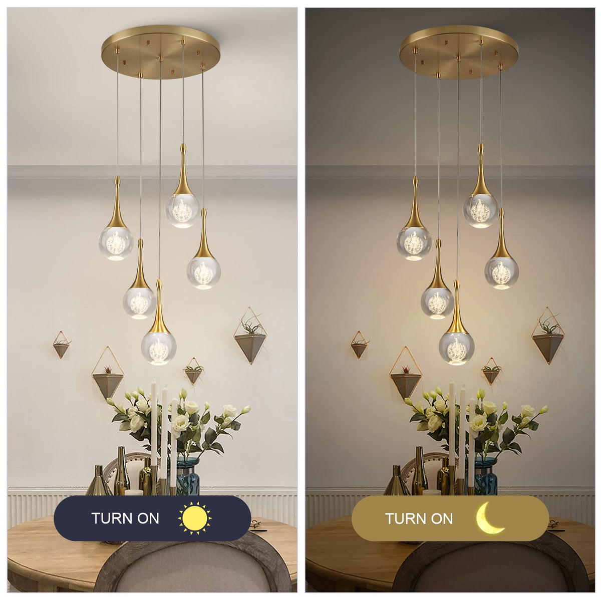 Modern 5-Light Gold Led Crystal Teardrop Cluster Pendant Lighting- Advanced K9 Crystal Teardrop Globe.&Nbsp;-Hight Quality Intergrate Led Source.&Nbsp;-Exqusite Laser Engraving Pattern.-10%-100% Stepless Dimming, Set The Perfect Illumination For Your Space.-Turnable Scrwe Cable Lock,Freely Adjust To Suit Your Desire Hanging Length.- Fit Both Flat And Slanted Ceilings. &Nbsp;Specifications&Nbsp;&Nbsp;?Light Informationcategory: Chandelier&Nbsp;/&Nbsp;Pendant Lightusage:&Nbsp;Dining Room, Living Room, Kitchen, Bedroom, Entry Wall,&Nbsp;Bathroom......Style: Modern&Nbsp;?Dimensionslampshade: 3.94 X 9.25''Canopy: 13.78''Maximum Length From Bottom Of The Lamp To Ceiling: 59 &Nbsp;&Nbsp;?Light Source Technical Detailsbulb Type: Ledwattage: 25Wvoltage: Ac 90V-130Vlumen: 2000Lmcct: 3000K(Warm White)&Nbsp;?Material And Colourmaterial: K9 Crystal + Aluminumfinishes: Finishedcolor: Gold&Nbsp;Package Included1 X Aryphant Led Crystal Pendant Light1 X Assemble Kit1 X User Manual