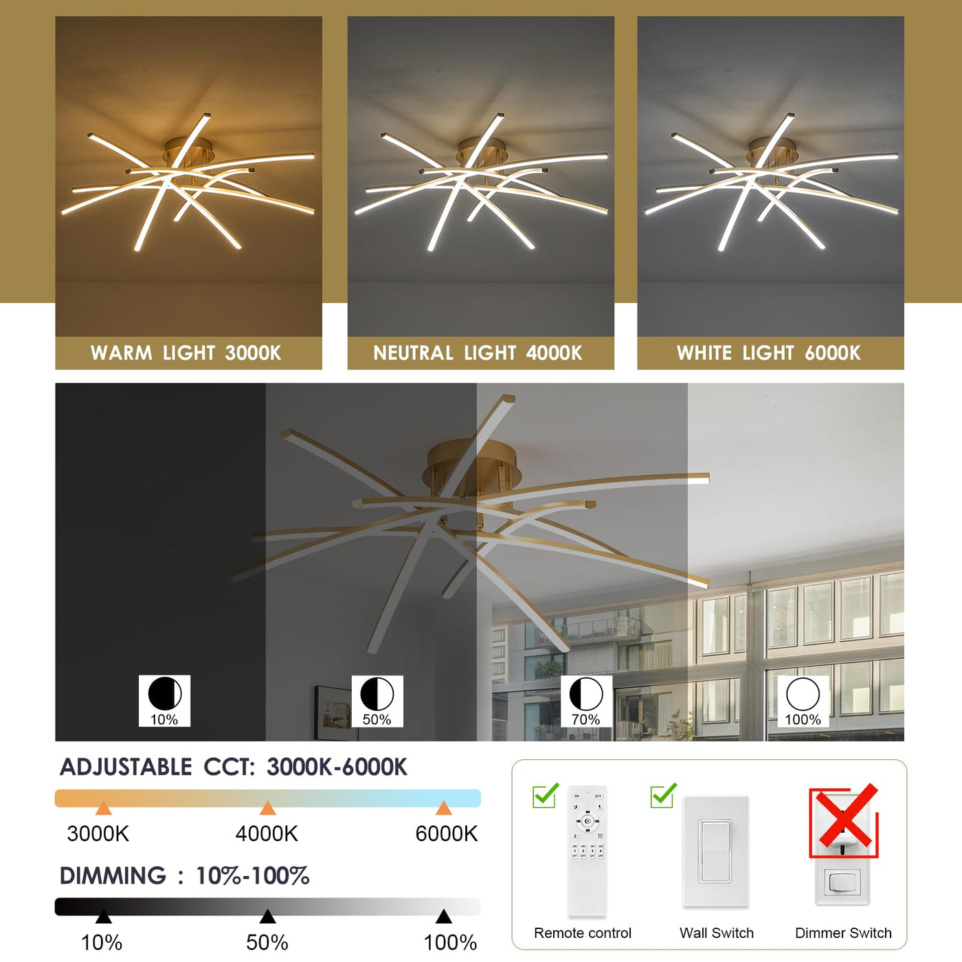 Airyphant Gold Led Chandelier Semi Flush Mount Ceiling Light, 65W Remote Control Ceiling Lighting Fixture For Living Room Dining
