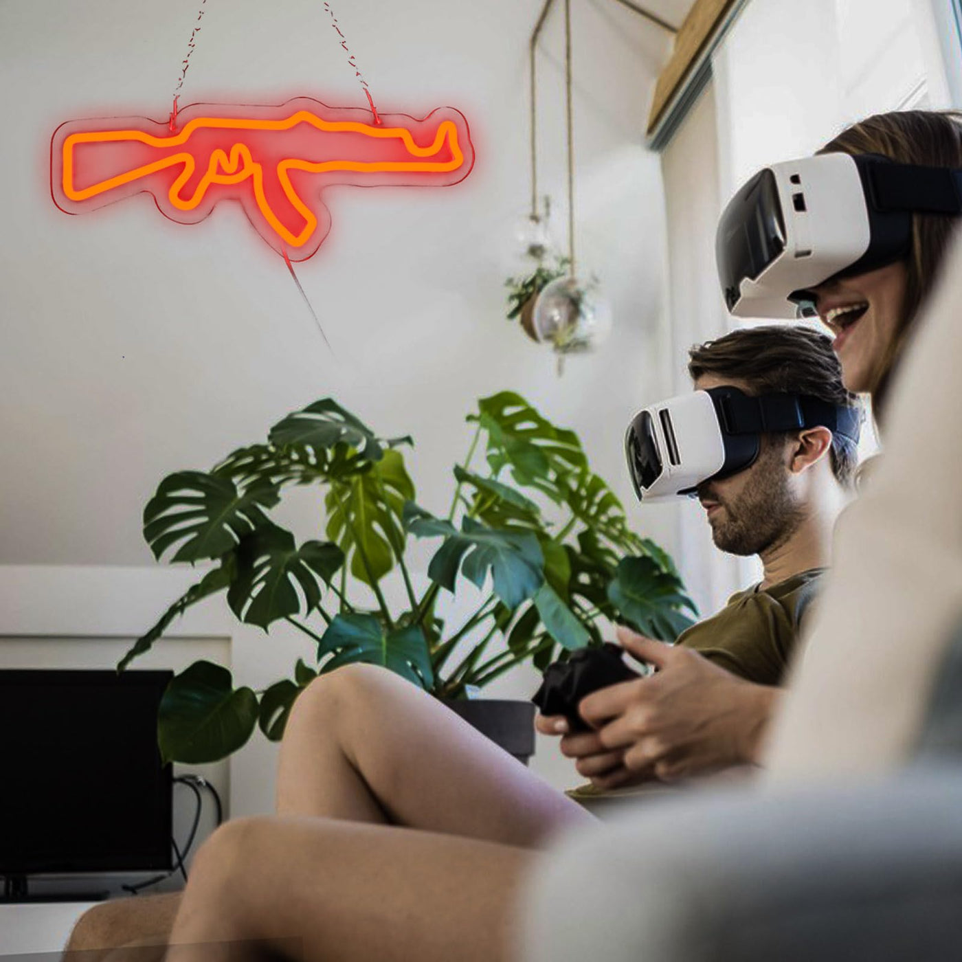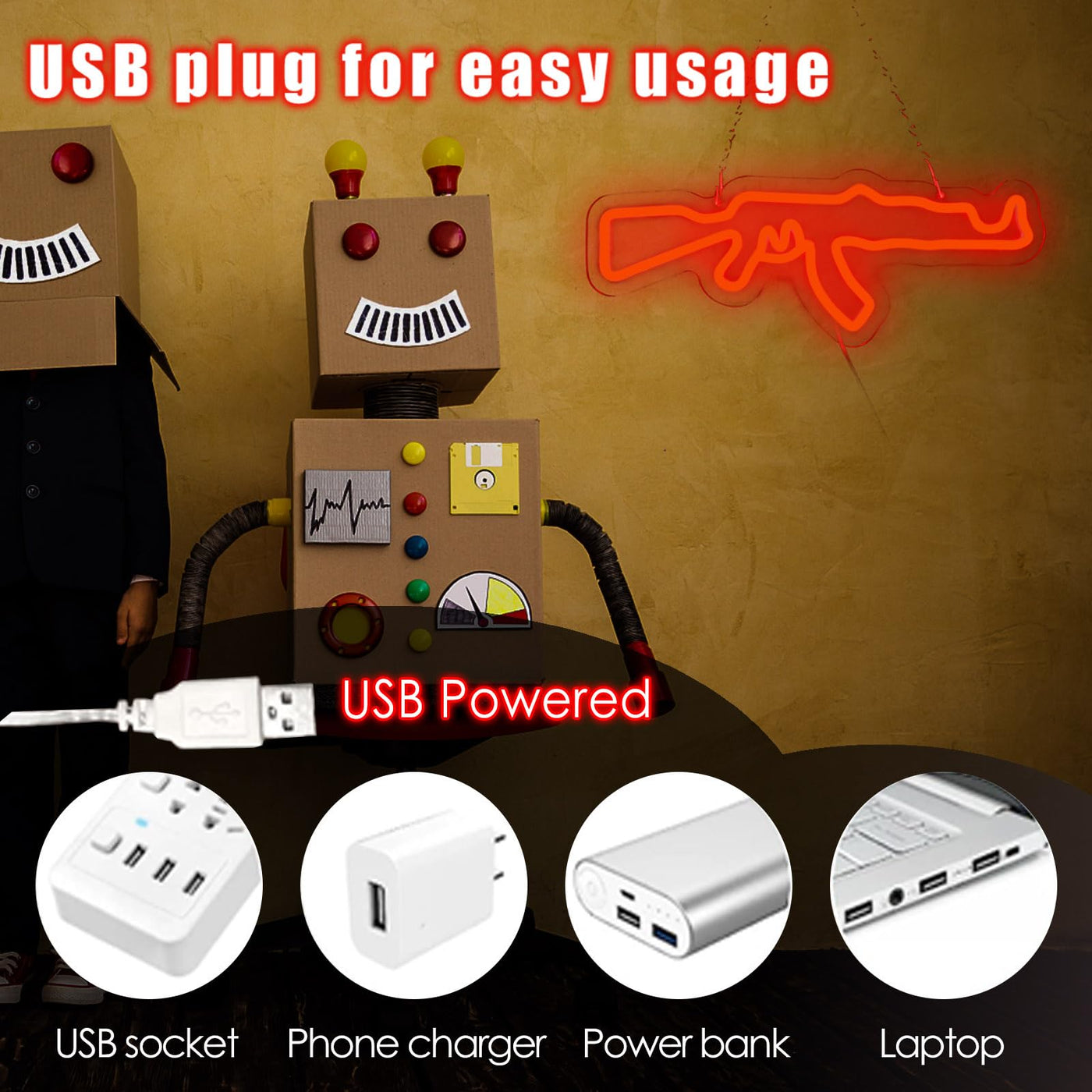 Q: What material is the neon sign made of?A: The AK47 Gun Neon Sign is crafted from high-quality acrylic and features a flexible neon tube, ensuring durability and a vibrant glow without overheating.