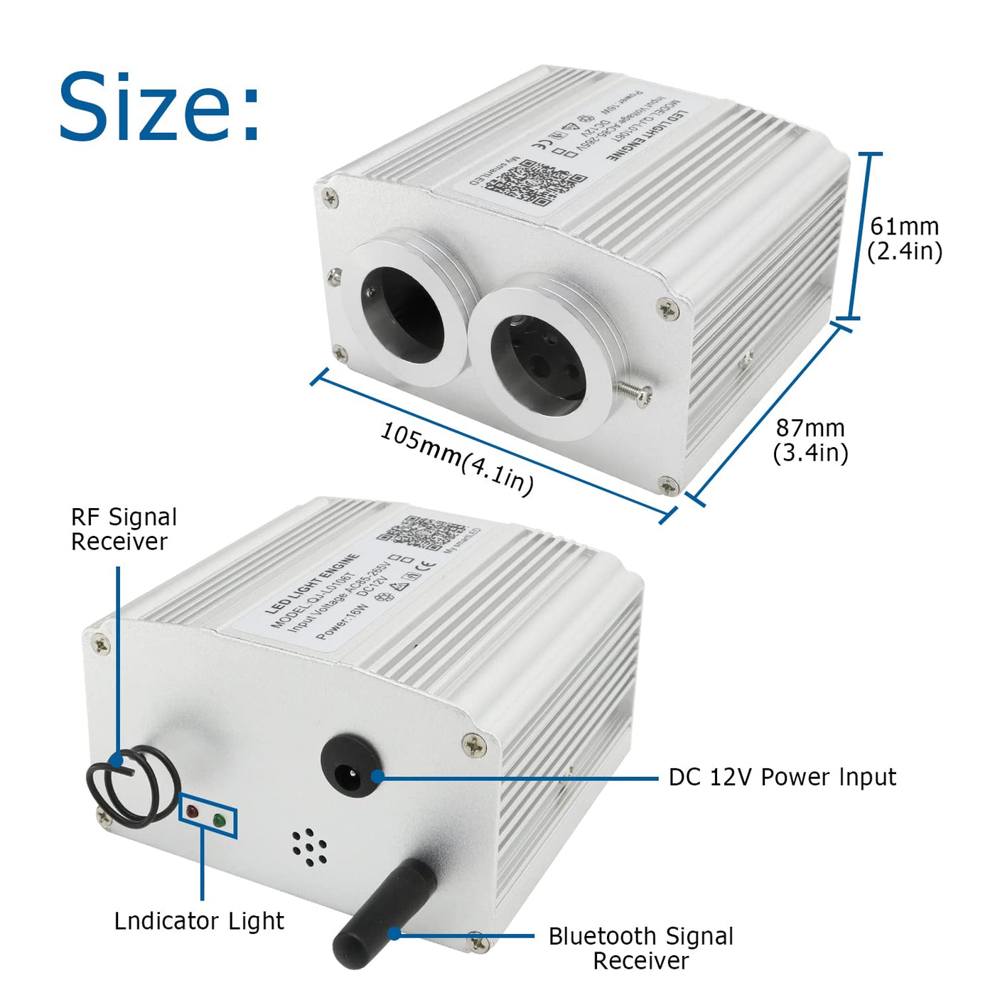 Upgraded APP control music activated dual head version connected via Bluetooth then you can find in your APP: 1 More than 16 Million colors of static colors available, not just 8 2 Brightness adjustable from 1%-100%, not just 8 level 3 20 dynamic modes are available, not just 6 options 4 Multi modes can be controled by one APP 5 control in group if you have more than one this light kits More functions waiting for you to explore APP control let you control your light kit more convenient Parameter of 16W RgBW dual head twinkle+music+App light kit: Work voltage: Ac 110265V 5060Hz, Dc 12V Power: 16W Light color: RgBW (cREE chip) Main Function: Twinkle effect (4-level)+static color+dynamic mode+music mode control Way: Remote controller, APP control after bluethooth connected The fiber cable operation temperature: -58AF - 167AF Diameter of each fiber: 003+004+006in075+1+15mm Quantity of fiber cables: 860pcs Length of fiber cable: 98ft3m Remote type: 28 key RF remote Shell material: Aluminum Diameter of connector: 20mm*2 Lifetime: Over 50,000 hours Light source device size: L105*W87*H61mm Remoter dimension: L85*W52*H7mm Warranty: 2 years Package included: 1x 16wAdual head RgBW twinkle music APP controlAlight engine 2x 98ft3m(400pcs*075mm+20pcs*1mm+10pcs*15mm) end glow fiber optic cable 1x 28key RF remote controllerA(Battery NOT included) 1x car use plug 1x US power adapter 1x User manual