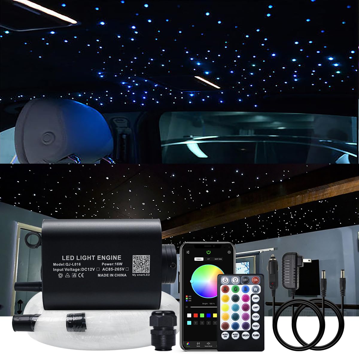 Complete Kit: Includes a 16W RGBW music APP control light engine, 28-key RF remote control (battery not included), 150pcs of 0.75mm fiber optic cables, a US power adapter, car use plug, and user manual.