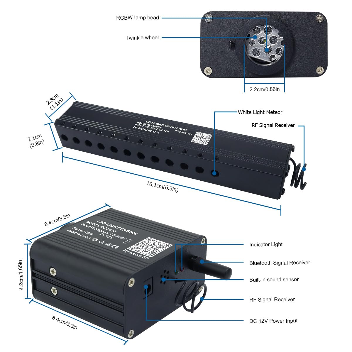 Akepo New Version Small Size 16W Rgbw Twinkle App With Meteor Effect Fiber Optic Light: 1.Smaller Size Than Regular Twinkle Light Engine. 2. Use App To Control It And Get Rid Of The Remote Control! 3. Multiple Color And Modes Can Be Controlled By App. 4. With Music Activated Mode, You Can Control All Functions With Your Phone. 5. With Shooting Star Effect. More Functions Waiting For You To Explore! App Control Let You Control Your Light Kit More Convenient! Parameter: Work Voltage: Ac 85~265V 50/60Hz, Dc 12V Power: 16W Light Color: Rgbw Remote Function: Meteor Effect+Twinkle Effect+Static Color+Dynamic Mode+Music Activated Mode Control Type: 28Key Remote Control+App The Fiber Cable Operation Temperature: -58F- 167F Diameter Of Each Fiber: 0.03In/0.75Mm Quantity Of Fiber Cables: 650Pcs Length Of Fiber Cable: 13.1Ft/4M Shell Material: Aluminum Diameter Of Connector: 22Mm. 7Mm*12 Holes Meteor Light Engine Lifetime: Over 50,000 Hours Light Source Device Size: L84*W84*H42Mm, L161*W21*H28Mm(Meteor) Remoter Dimension: L105*W58*H9Mm Package Included: 1X 16W Small Size Rgbw Twinkle Music App Control Light Engine 1X 3W 12Holes White Light Meteor Light Engine 1X 650Pcs*0.03In/0.75Mm*13.1Ft/4M End Glow Fiber Optic Cable 1X 12 Bunch (5Pcs*0.04In/1Mm*3M) Fiber Optic Cable 1X 28Key Rf Remote Controller (Battery Not Included) 1X Us Power Adapter 1X Car Use Plug 1X Splitter Cable (1 Male To 2 Female) 1X User Manual