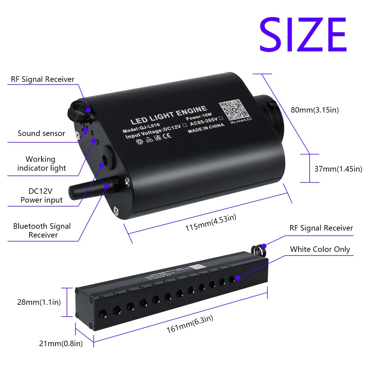 - **Comprehensive Package**: The kit includes everything you need: 1x 16W RGBW APP control light engine, 1x 3W shooting star light engine, 1x 28-key RF remote control (battery not included), 550pcs fiber optic cables (0.75mm, 13.1ft), US power adapter, car use plug, splitter cable, and user manual.
