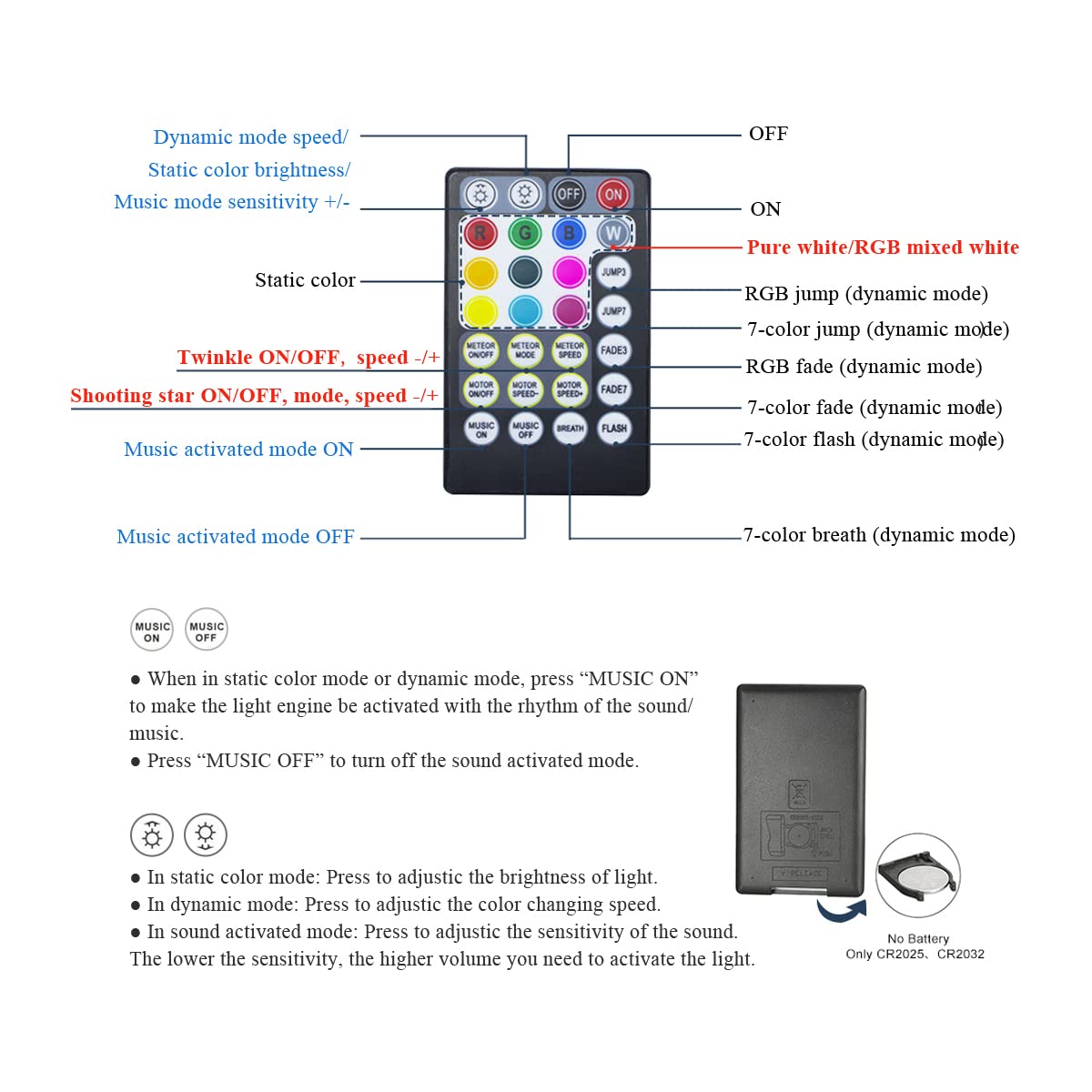 - **Complete Package**: The kit includes everything you need: a 16W RGBW light engine, a 28-key remote control (battery not included), a 5W shooting star engine, and multiple fiber optic cables, ensuring effortless setup and use.