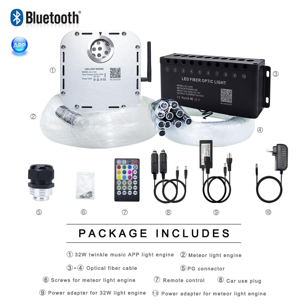 Upgrade App Control+Twinkle+Music Mode+Shooting Star Fiber Optic Light Kit, Multi Modes In One App, Let Your Control More Convenient! Parameter Of 32W Rgbw Twinkle Music App Control Light Engine: Work Voltage: Ac 85~265V 50/60Hz, Dc 12Vpower: 32W Light Color: Rgbw (Cree Chip) Main Function: Twinkle Effect, Music Control (Sound Activated), Static Mode Light, Dynamic Mode Lightdiameter Of Connector: 29Mmdiameter Of Each Fiber: 0.03In/0.75Mm+0.04In/1Mm+0.06In/1.5Mmquantity Of Fiber Cables: Total 800Pcs Length Of Fiber Cable: 16.4Ft/5Mlight Source Device Size: L149*W149*H90Mmparameter Of 5W White Light Meteor Light Engine:Work Voltage: Dc 12V Power: 5Wmax Power: 72W Output Current:6Alight Color: White Main Function: Multiple Mode Of Shooting Star Effect, Mode Speed Adjustable Fiber Coupling Head: Inner Diameter 7Mm*10 Holesdiameter Of Each Fiber: 0.04In/1Mmquantity Of Fiber Cables: 5Pcs*10 Bundles Length Of Fiber Cable: 16.4Ft/5Mlight Source Size: L155*W75*H35Mm Fiber Cable Operation Temperature: -58F- 167F Light Engine Shell Material: Aluminum Lifetime: Over 50,000 Hoursremote Type: App Via Bluetooth, Remote Controlremoter Dimension: L85*W52*H7Mmwarranty: 2 Yearspackage Included:1X 32W Rgbw Twinkle Music App Control Light Engine 1X 28Key Rf Remote Controller (Battery Not Included) 1X 16.4Ft(500Pcs*0.03In+250Pcs*0.04In+50Pcs*0.06In) End Glow Fiber Optic Cable 1X 5W White Light Meteor Light Engine1X 10 Bunch (5Pcs*1Mm*5M) Fiber Optic Cable 1X 10Pcs Crystals2X Us Power Adapter2X Car Use Plug1X User Manual[About Us] Huaxi Innovation Is A Supplier That Providing Premium Fiber Optic Light Kits. We Support Customization Service For Free! Welcome To Customize All Kinds Of Fiber Optic Light Kit!