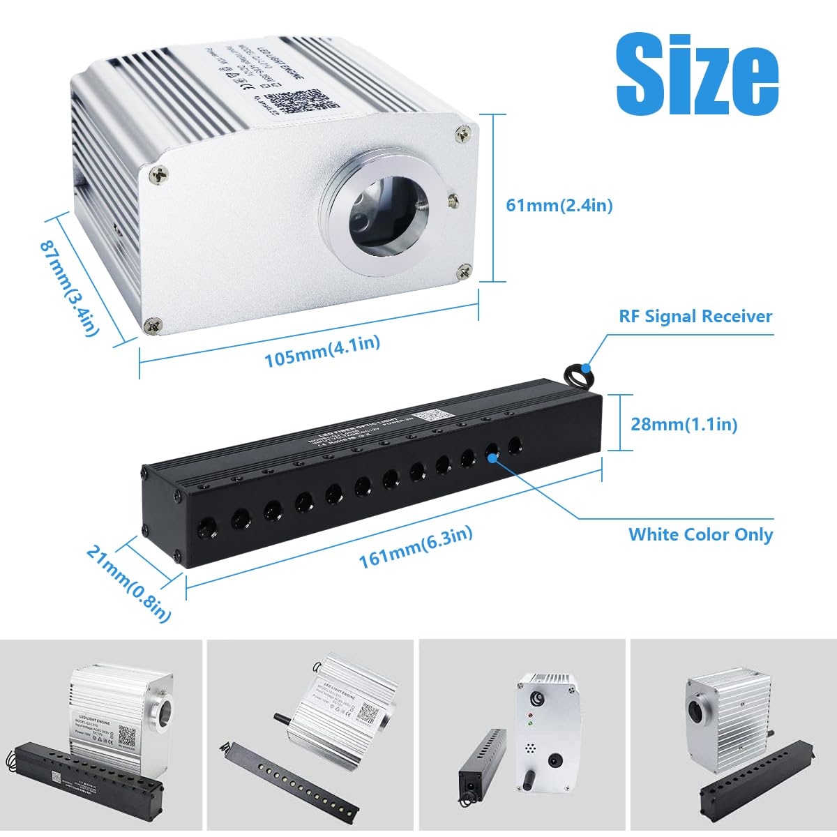 This innovative lighting kit includes a powerful RGBW twinkle music APP control light engine and a meteor light engine. The product is constructed from durable aluminum, ensuring longevity and performance. The included fiber optic cables, measuring 9.8ft (3m) in length, are designed for flexibility and easy installation, allowing users to create captivating light displays.