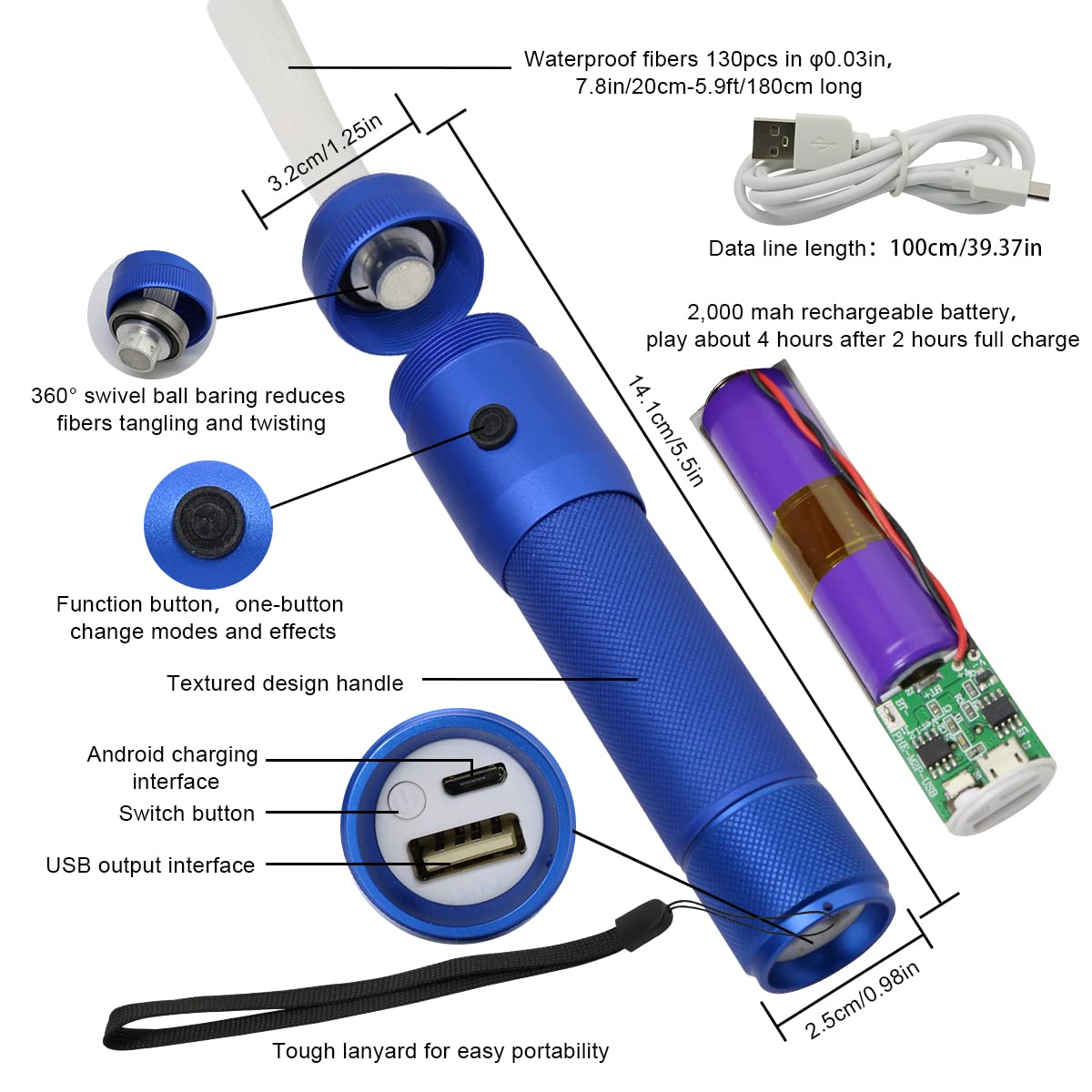 - **Multi-Functional Use**: More than just a dance whip, it doubles as an emergency power bank for charging your phone or other devices via USB. Remove the fiber strands, and it transforms into a compact flashlight with colorful lighting and auto-flash effects.