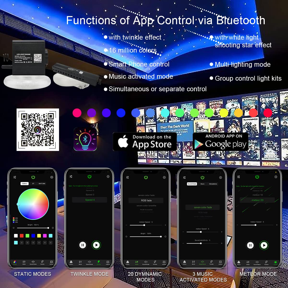Akepo New Version Small Size 16W Rgbw Twinkle App With Meteor Effect Fiber Optic Light: 1.Smaller Size Than Regular Twinkle Light Engine. 2. Use App To Control It And Get Rid Of The Remote Control! 3. Multiple Color And Modes Can Be Controlled By App. 4. With Music Activated Mode, You Can Control All Functions With Your Phone. 5. With Shooting Star Effect. More Functions Waiting For You To Explore! App Control Let You Control Your Light Kit More Convenient! Parameter: Work Voltage: Ac 85~265V 50/60Hz, Dc 12V Power: 16W Light Color: Rgbw Remote Function: Meteor Effect+Twinkle Effect+Static Color+Dynamic Mode+Music Activated Mode Control Type: 28Key Remote Control+App The Fiber Cable Operation Temperature: -58F- 167F Diameter Of Each Fiber: 0.03In/0.75Mm Quantity Of Fiber Cables: 450Pcs Length Of Fiber Cable: 9.8Ft/3M Shell Material: Aluminum Diameter Of Connector: 22Mm. 7Mm*12 Holes Meteor Light Engine Lifetime: Over 50,000 Hours Light Source Device Size: L84*W84*H42Mm, L161*W21*H28Mm(Meteor) Remoter Dimension: L105*W58*H9Mm Package Included: 1X 16W Small Size Rgbw Twinkle Music App Control Light Engine 1X 3W 12Holes White Light Meteor Light Engine 1X 450Pcs*0.03In/0.75Mm*9.8Ft/3M End Glow Fiber Optic Cable 1X 12 Bunch (5Pcs*0.04In/1Mm*3M) Fiber Optic Cable 1X 28Key Rf Remote Controller (Battery Not Included) 1X Us Power Adapter 1X Car Use Plug 1X Splitter Cable (1 Male To 2 Female) 1X User Manual