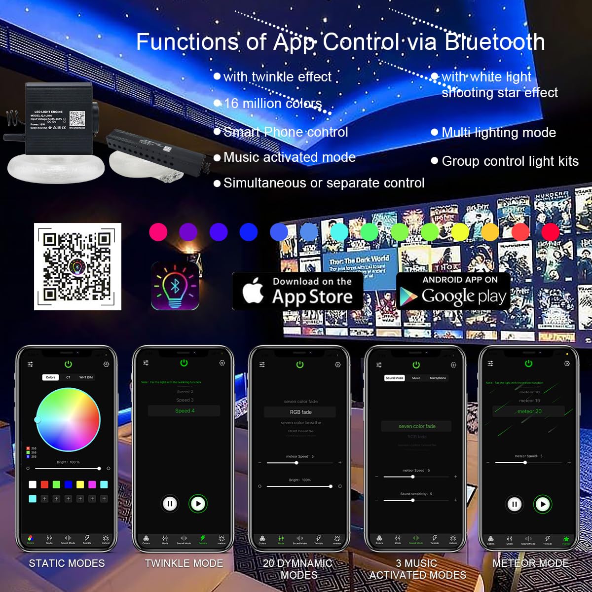 Akepo New Version Small Size 16W Rgbw Twinkle App With Meteor Effect Fiber Optic Light: 1.Smaller Size Than Regular Twinkle Light Engine. 2. Use App To Control It And Get Rid Of The Remote Control! 3. Multiple Color And Modes Can Be Controlled By App. 4. With Music Activated Mode, You Can Control All Functions With Your Phone. 5. With Shooting Star Effect. More Functions Waiting For You To Explore! App Control Let You Control Your Light Kit More Convenient! Parameter: Work Voltage: Ac 85~265V 50/60Hz, Dc 12V Power: 16W Light Color: Rgbw Remote Function: Meteor Effect+Twinkle Effect+Static Color+Dynamic Mode+Music Activated Mode Control Type: 28Key Remote Control+App The Fiber Cable Operation Temperature: -58F- 167F Diameter Of Each Fiber: 0.03In/0.75Mm Quantity Of Fiber Cables: 550Pcs Length Of Fiber Cable: 9.8Ft/3M Shell Material: Aluminum Diameter Of Connector: 22Mm. 7Mm*12 Holes Meteor Light Engine Lifetime: Over 50,000 Hours Light Source Device Size: L84*W84*H42Mm, L161*W21*H28Mm(Meteor) Remoter Dimension: L105*W58*H9Mm Package Included: 1X 16W Small Size Rgbw Twinkle Music App Control Light Engine 1X 3W 12Holes White Light Meteor Light Engine 1X 550Pcs*0.03In/0.75Mm*9.8Ft/3M End Glow Fiber Optic Cable 1X 12 Bunch (5Pcs*0.04In/1Mm*3M) Fiber Optic Cable 1X 28Key Rf Remote Controller (Battery Not Included) 1X Us Power Adapter 1X Car Use Plug 1X Splitter Cable (1 Male To 2 Female) 1X User Manual