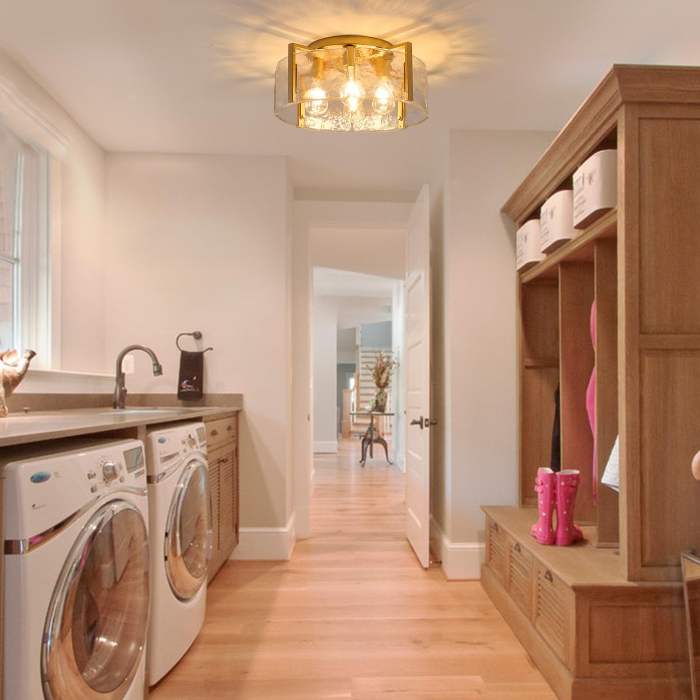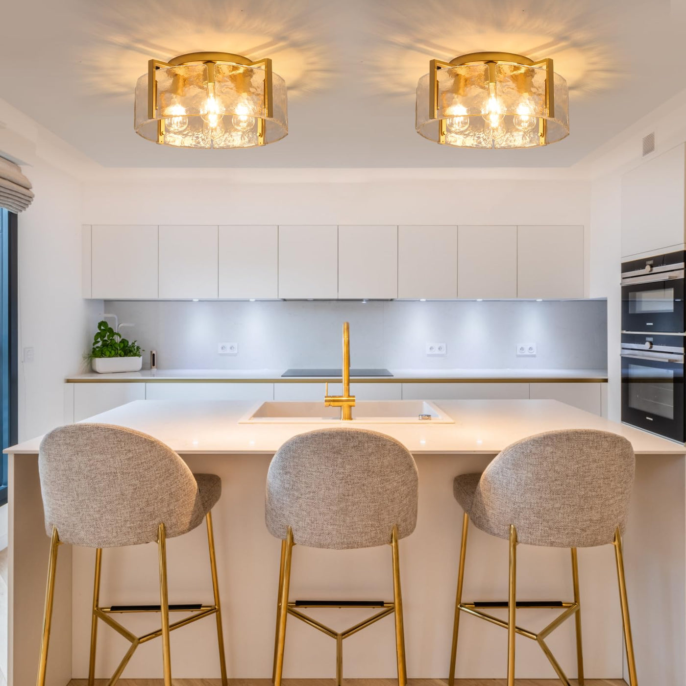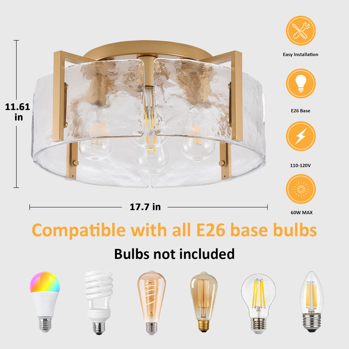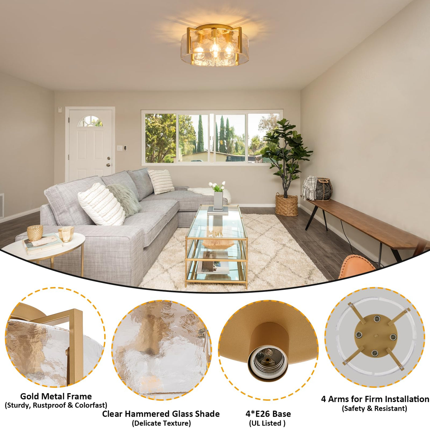 Our Gold Semi Flush Mount Ceiling Light Fixture, The Perfect Addition To Any Modern Home. This Ceiling Lights Are Designed To Bring A Touch Of Rustic Charm To Your Space While Providing Ample Illumination. Crafted With A Sturdy Metal Base And A Delicate Water Ripple Glass Lampshade, This Bedroom Ceiling Light Not Only Add A Farmhouse Vibe But Also Allows The Lights To Diffuse, Creating A Warm And Inviting Atmosphere. The Matte Gold Metal Finish Adds A Modern Touch, Making Gold Light Fixture Suitables For Various Interior Styles. With Its Flush Mount Design, This Dining Light Fixture Mount Is Easy To Clean And Maintain, Ensuring Long-Lasting Durability. The Evenly Spread Light Ensures That Your Space Is Well-Lit Without Any Glare, Protecting Your Eyes. Farmhouse Ceiling Light Also Includes All Necessary Mounting Hardware And Instructions, Making Installation A Breeze. This Modern Ceiling Light Fixture Is Compatible With A Variety Of E26 Base Bulbs, Allowing You To Choose The Perfect Brightness And Ambiance For Your Room. With Its Modern Design And Versatility, This 18 Inch Gold Flush Mount Light Fixture Is Suitable For All Interior Design Styles, Such As Bedroom, Living Room, Entryway, Kitchen, Bathroom, Dining Room, Foyer, Hallway, Porch, Office, Hotel, Etc. Upgrade Your Home Decor With Our Bedroom Chandelier Ceiling Light And Enjoy The Perfect Blend Of Modern And Rustic Design. Illuminate Your Space With Elegance And Style.