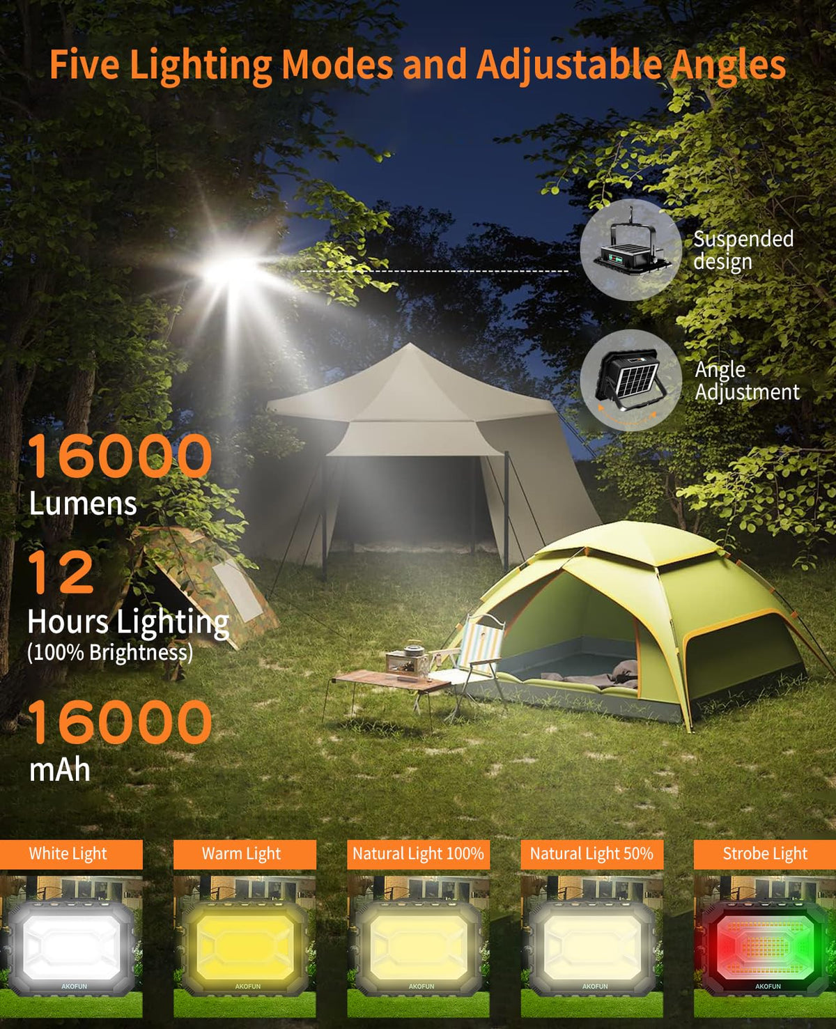 Akofun 200W Led Solar Work Light Rechargeable, 16000Lm Magnetic Worklight 3000K/4500K/6500K, 16000Mah Battery, Ip66 Waterproof P