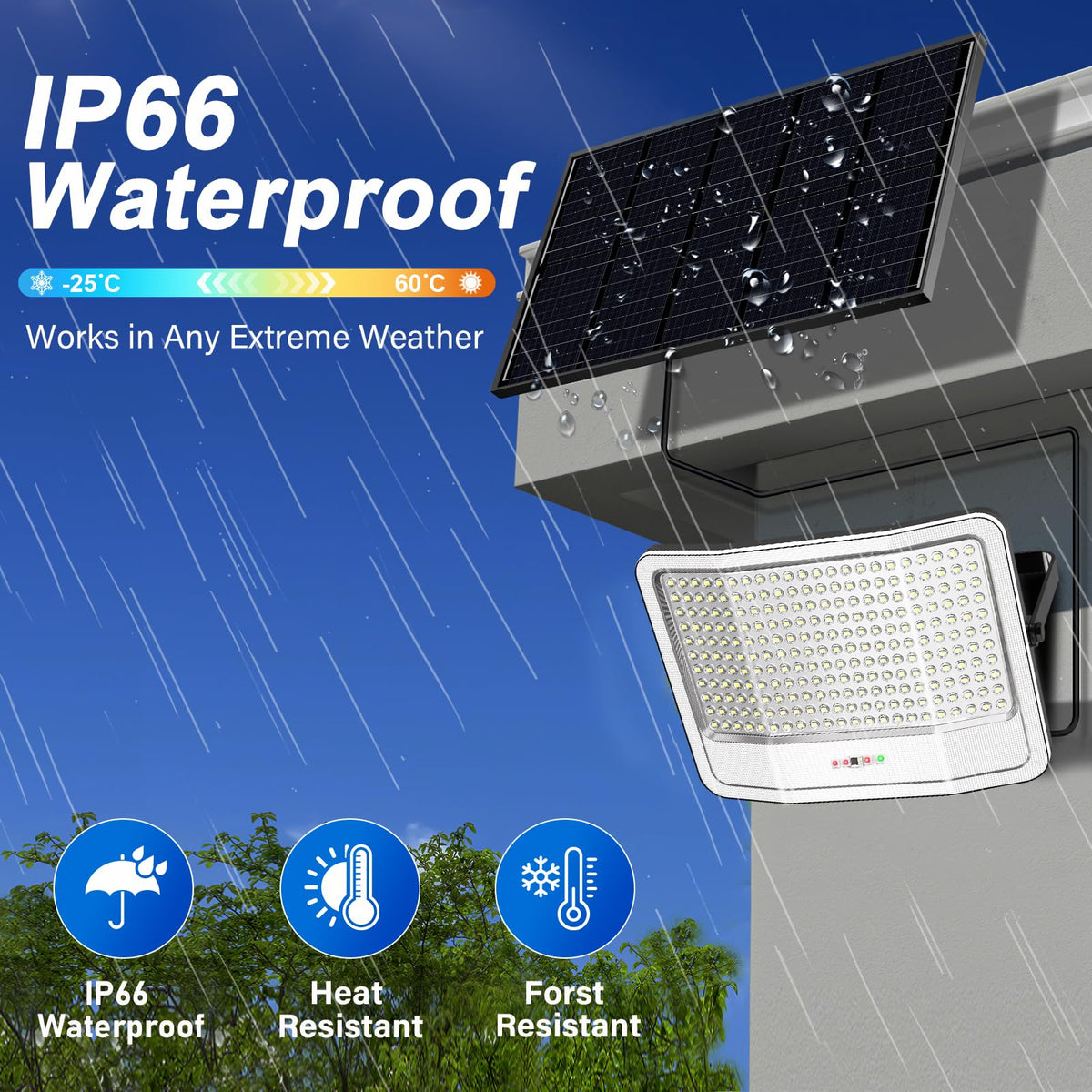 Q: Are these solar flood lights waterproof and durable?A: Yes, the AKOFUN Solar Flood Lights have an IP66 waterproof rating, ensuring they can withstand harsh weather conditions. The metal aluminum construction enhances their durability, making them suitable for various outdoor environments.