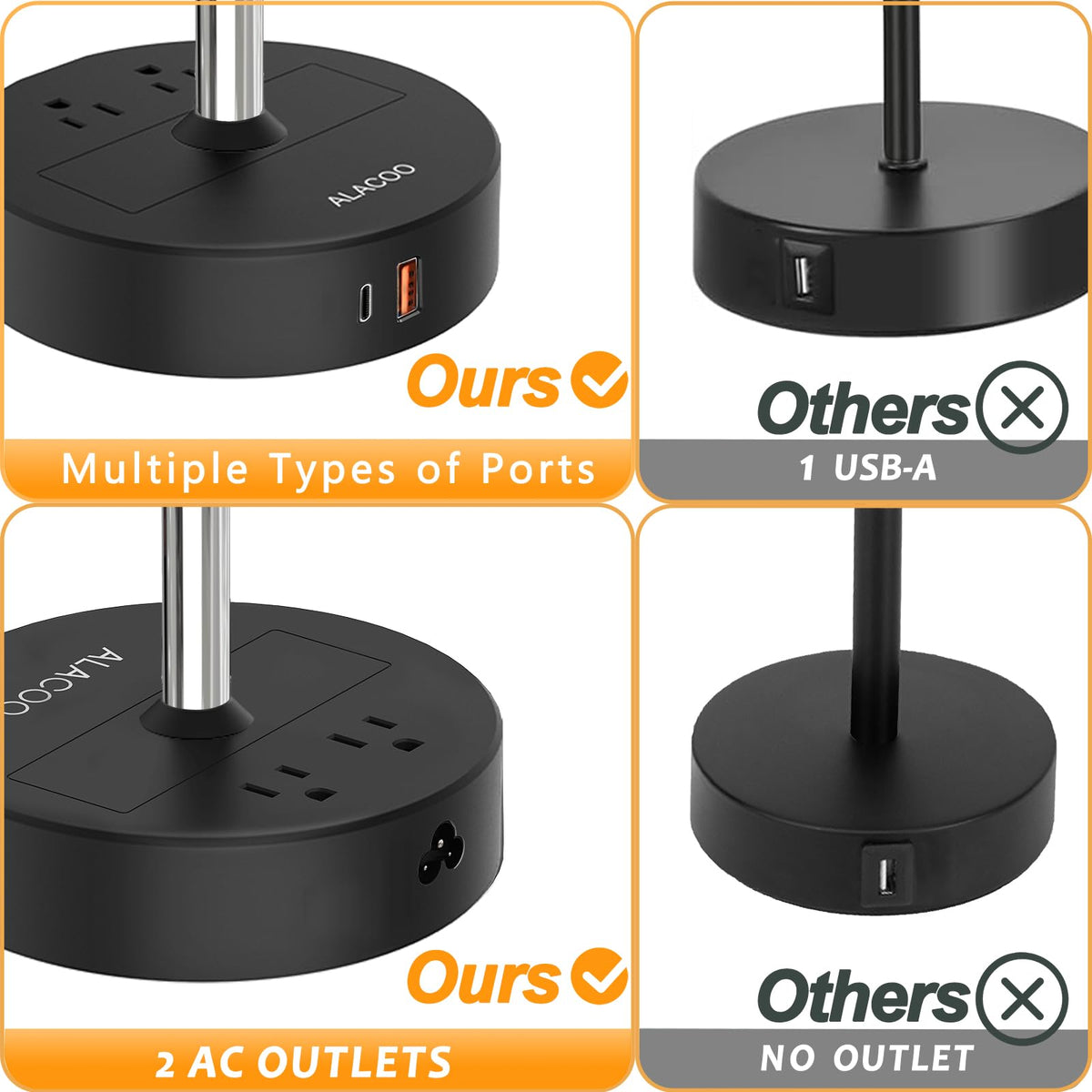 Q: What are the charging options available with the ALACOO Bedside Table Lamp?A: The ALACOO Bedside Table Lamp features a USB-C port (5V/2.1A), a USB-A port (5V/2.1A), and two 3-prong AC outlets, providing multiple charging options for your devices like phones, tablets, and laptops.