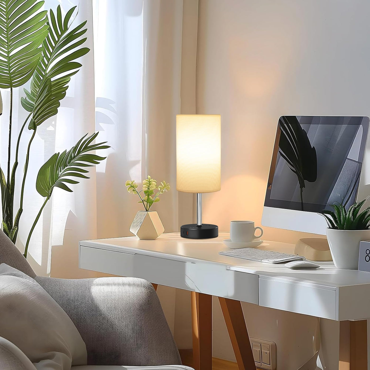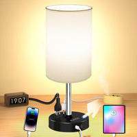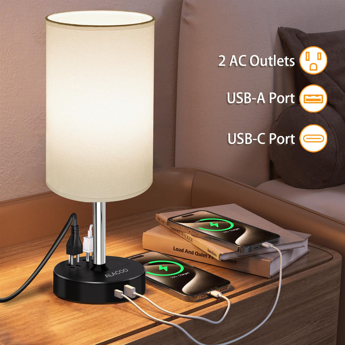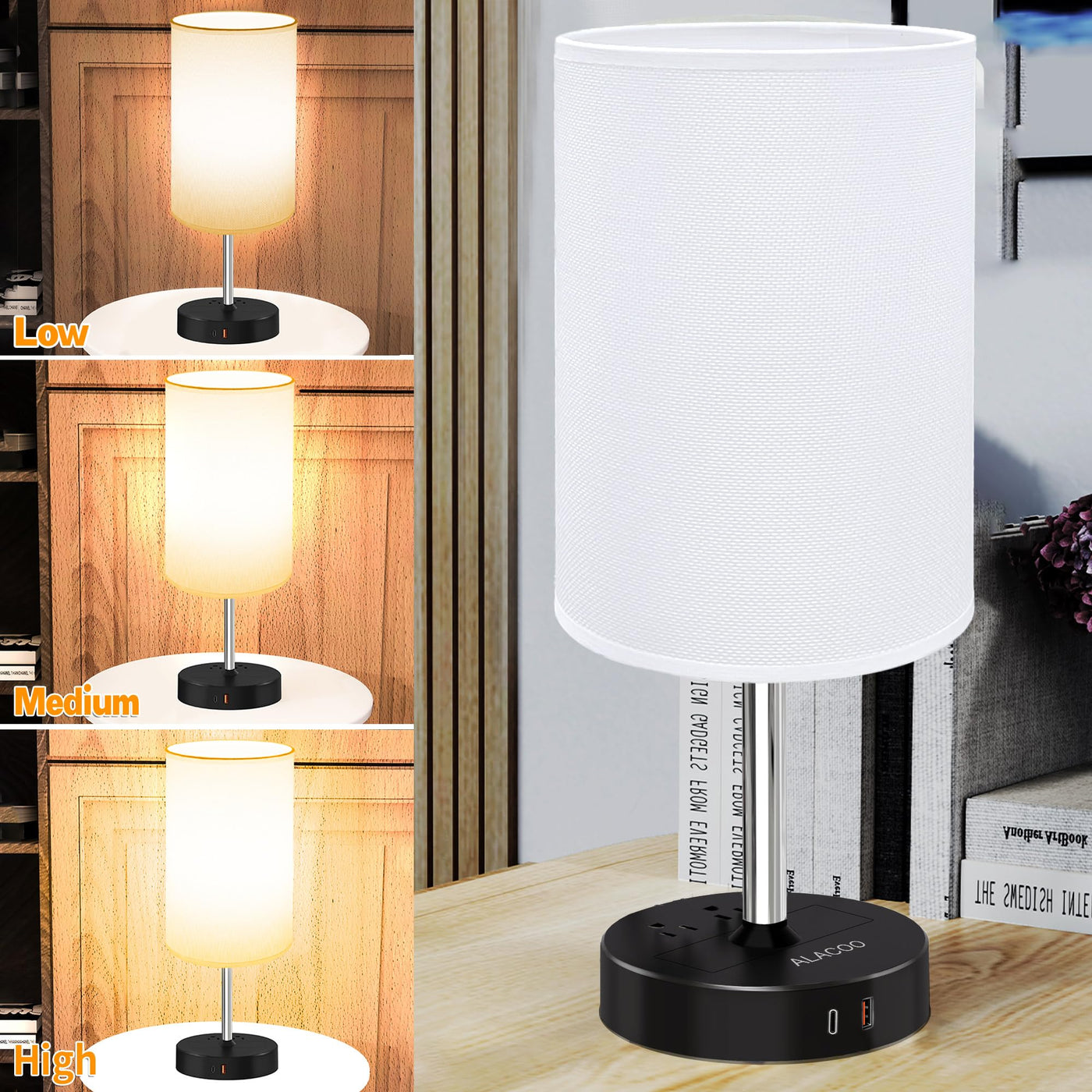 Multipurpose Bedside Lamp - This table lamp with a usb-c port(5V/2.1A) and a USB-A port(5V/2.1A) and (1000W) two 3-prong AC outlet.The extra outlets for charging a phone or tablet makes it very convenient to have next to my bed. | 3-Way Dimmable Touch Lamp - This smooth dimmable touch console nightstand light is equipped with a touch sensitive sensor, and the dimmable bedside table lamp offers 3 levels of brightness options (3000K low, 4000K medium,5000K high). You can easily to touch the base to turn the light on or off or adjust the lighting, making it very convenient to use. | Plug and Play Night Light - ALACOO LED desk lamp has better eye protection function. Better protect your eyes while studying and working under soft lighting. | Small Table Lamp with Charging Station - This small body and large capacity table lamp can be used for your phone at any time, pad, Laptop, humidifier, kindle, Charging speakers or other electronic devices, this small desk lamp is the best choice for family and oneself. | LED Light Bulb - Multifunction charger lamp equipped with 9W non-flicker LED bulbs is much more energy-efficient than traditional incandescent bulbs, with comparable brightness and longer lifespan. | High Quality Materials - The desk lamp base is made of high-quality plastic, and the lampshade is made of linen fabric, showcasing a high-end and atmospheric appearance. This design is not only suitable for various scene combinations, but also a good gift choice for family and friends.