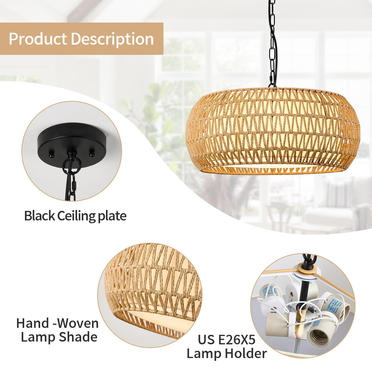 Alaislyc 19 Inch Boho Chandeliers For Dining Room 5-Lights Farmhouse Light Fixtures Large Pendant Light Hand Woven Dining Table