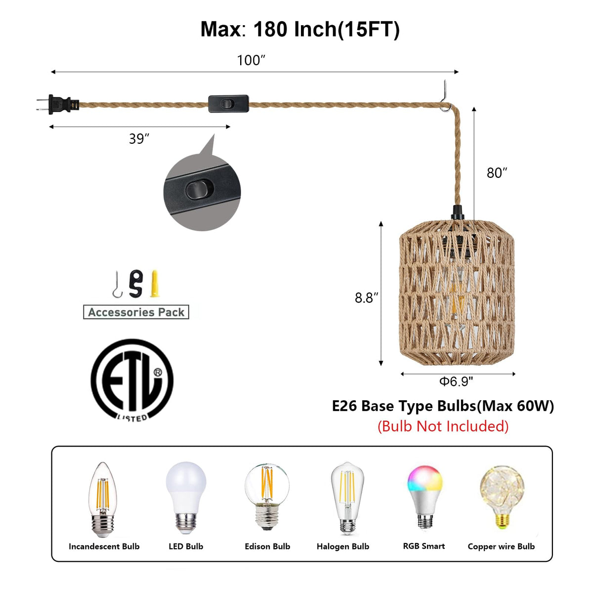 - **Easy Installation**: Compatible with all types of 1xE26 incandescent/LED bulbs (not included). The package includes all necessary hanging accessories, allowing for quick setup—just plug in the pendant light and screw in the bulbs.