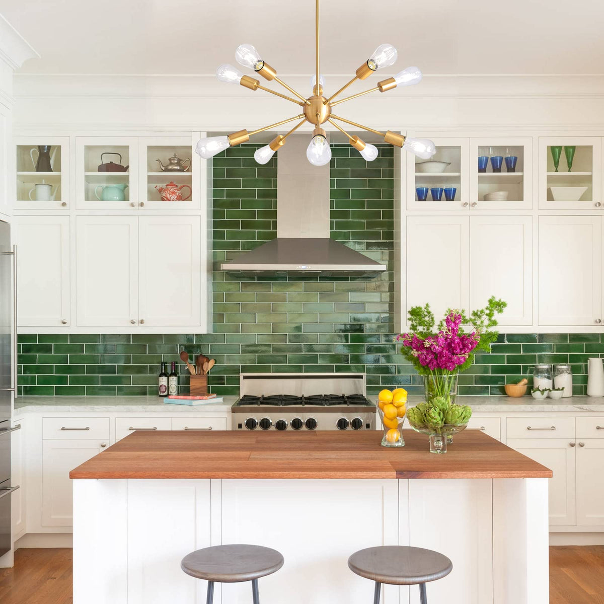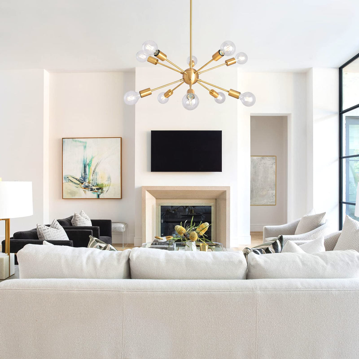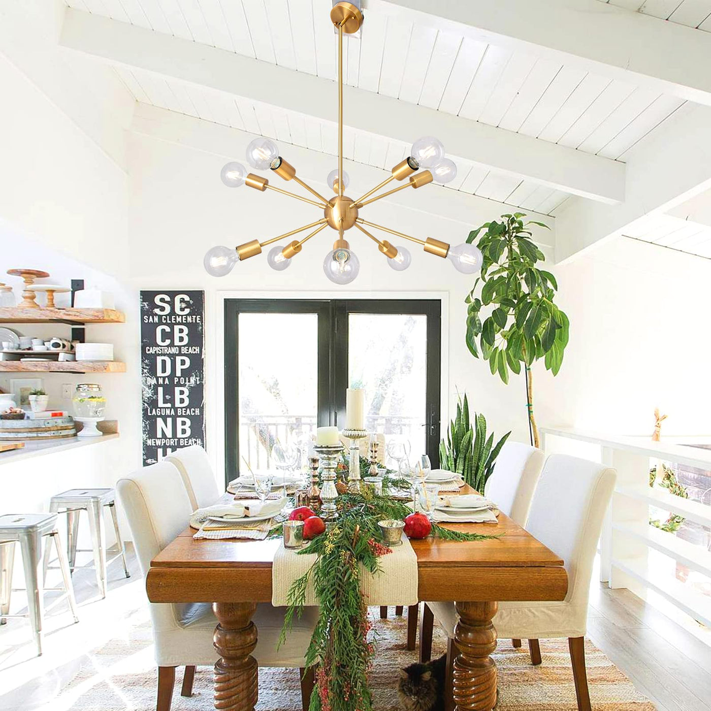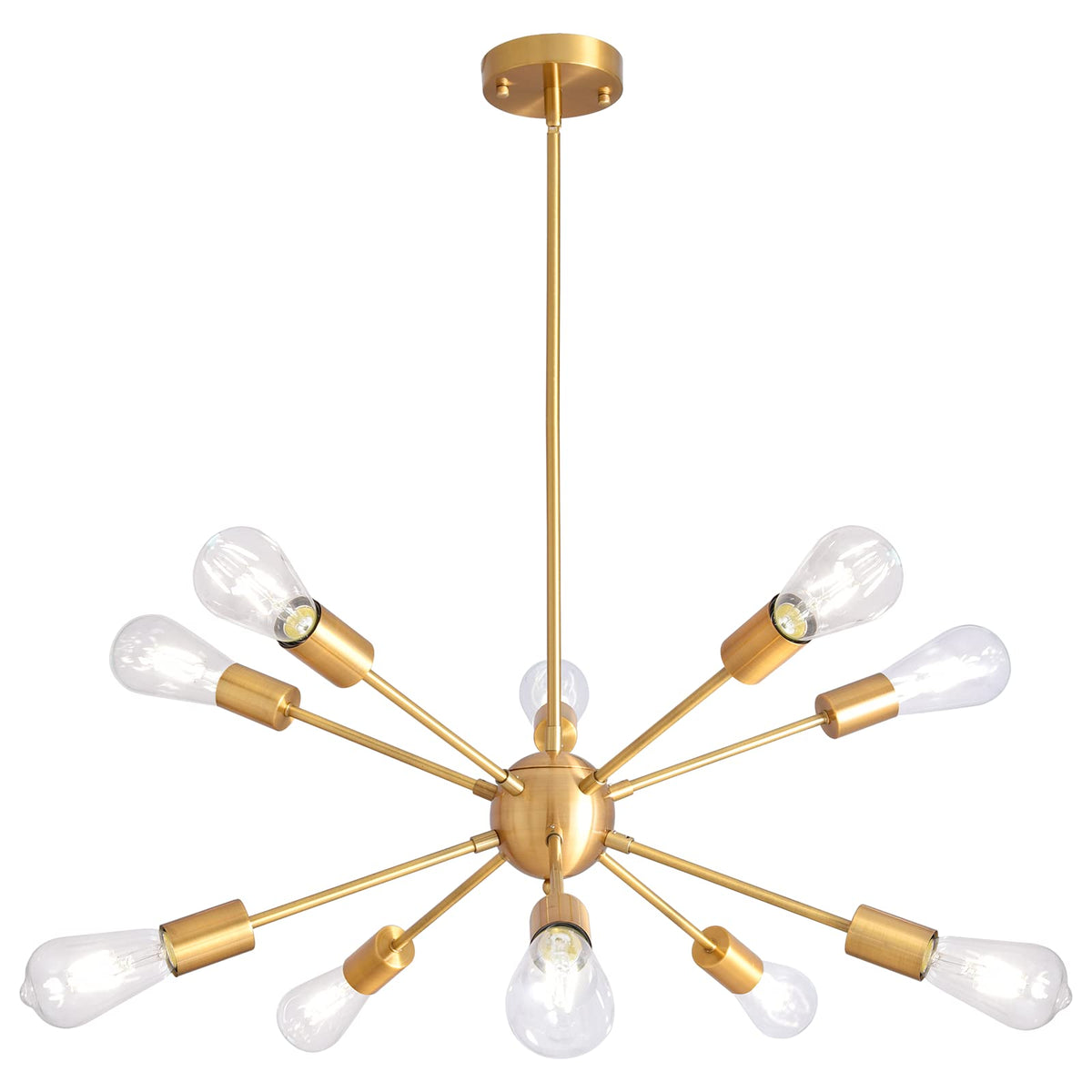 Product Details: Product Dimensions (Without Bulbs): Max height: 50.59 inches; Min height: 11.22 inches; Length: 29 inches; The diameter of the canopy: 4.7 inches; Primary material: metal; Fixture design: sputnik; Number of lights: 10; Finish: brushed brass; Sloped ceiling compatible: Yes; Bulb NOT included but required; Bulb base: E26; Maximum wattage (per bulb): 60 watts; Voltage: 110-120 V; Power source: hardwired; Style: industrial, mid century modern, vintage, etc; Applicable site: dining room, kitchen, living room, bedroom, front foyer, bar, coffee shop, restaurant, hallway, entryway, etc. Package includes: Brushed Brass Sputnik Chandelier x 1