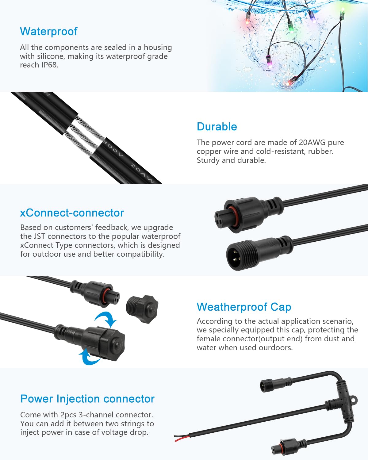 Xconnect & Large-spacing: Featuring an 8-inch large-spacing design, this product is specifically suited for extensive lighting setups. It comes with a female xConnect pigtail for easy connections to various controller ports, along with two T-shape xConnect power injection connectors to combat voltage drop across the 328ft length.