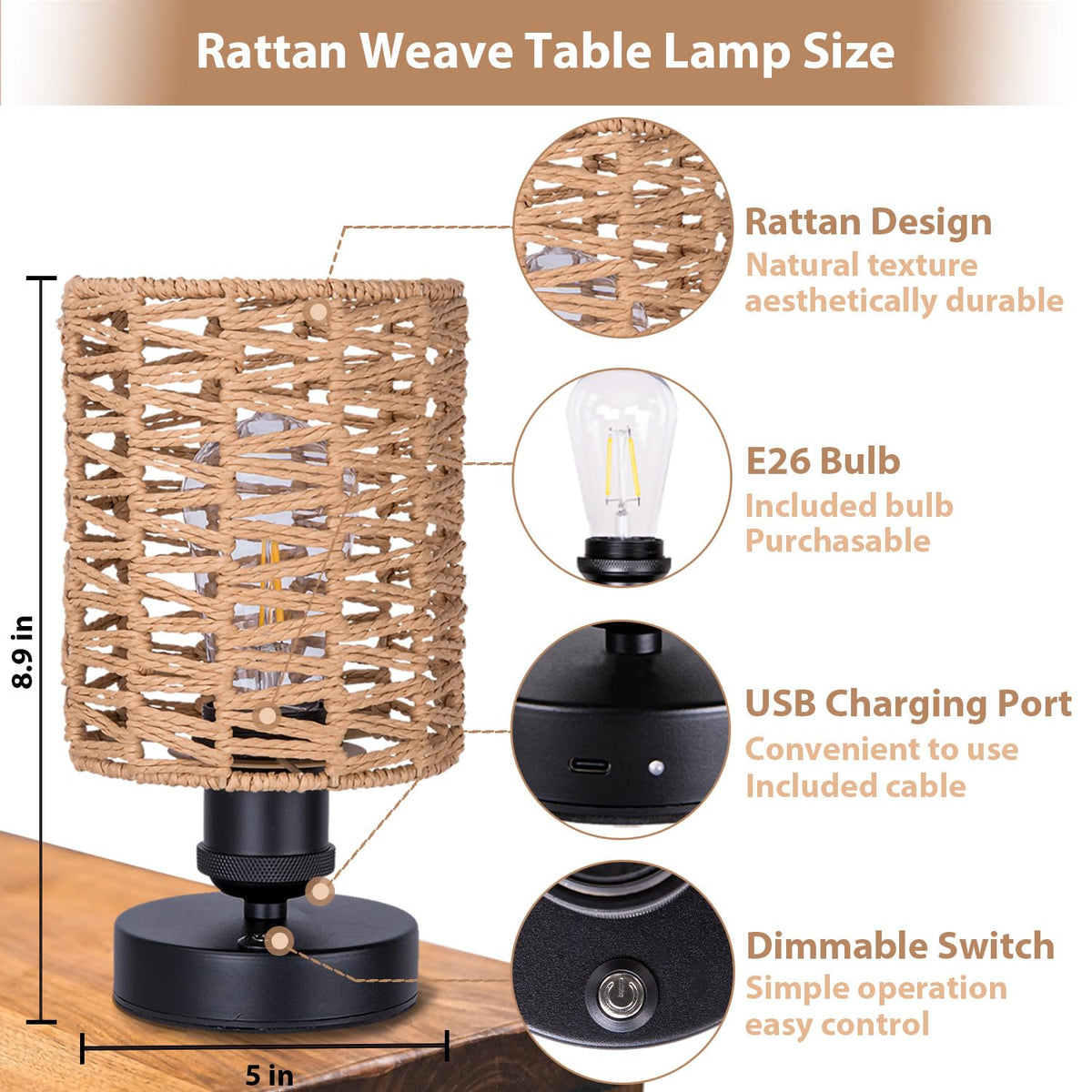 All Fortune Cordless Outdoor Table Lamps, Small Rattan Boho, Rechargeable Battery Operated For Outdoor Patio, Home, Living Room,