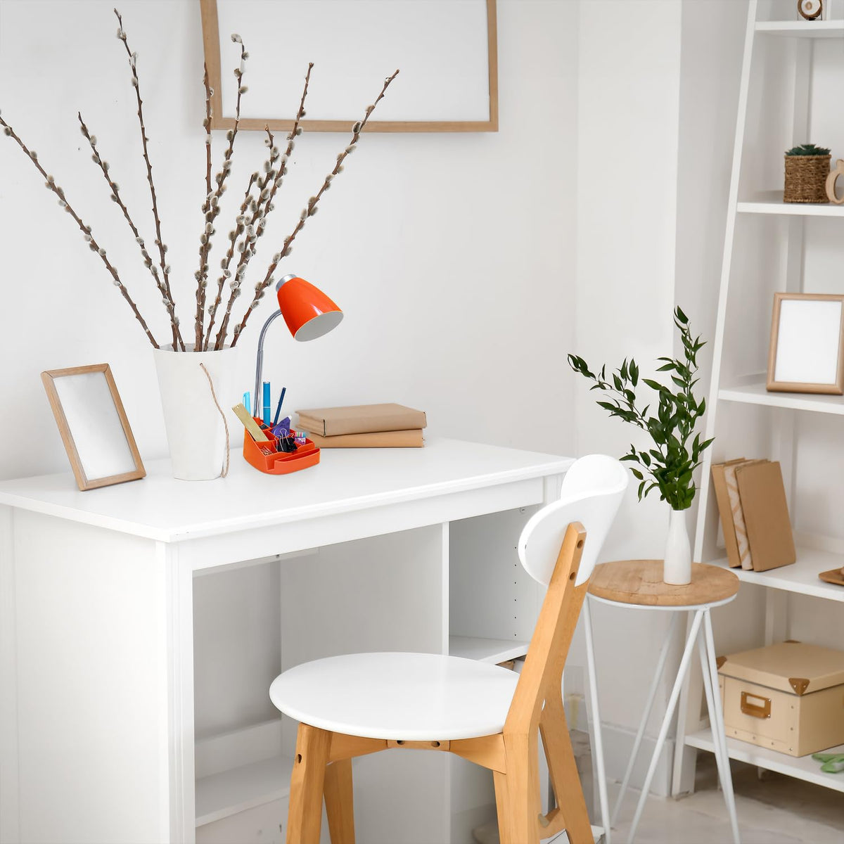 Elevate your workspace with this multifunctional plastic desk lamp. Designed with both functionality and style in mind, this lamp seamlessly combines task lighting with organizational convenience. This innovative desk lamp with multiple compartments is a game-changer in the realm of workspace illumination and is available in both basic and fun colors to match any room.Features :- This sleek and modern lamp features several built-in compartments strategically placed around its base, providing a dedicated space for notepads, a tablet/iPad stand, paper clips, and other office essentials.- This lamp arrives fully assembled, eliminating the need for any intricate setup. The only step involved is installing the required bulb (not included with your purchase).- This lamp accomodates a 40W equivalent Type A15 medium base bulb, which is not included in your purchase.*Note: Short CFL or energy saving bulb is recommended for maxium light output. 13W CFL bulb is equivalent to a 60W incandescent.- Features a convenient on/off rocker switch located on the base of the lamp.- Available in multiple colors, making it a versatile and customizable choice for those seeking to add a personalized touch to their living space.- The shade has a diameter of 4.5 inches and a height of 5 inches. Overall dimensions of the table lamp are 6.5'' L x 6.5'' W x 18.5'' H..Specifications :- Color/Finish : Orange- Assembly Required : No- Certifications and Listings : ETL.