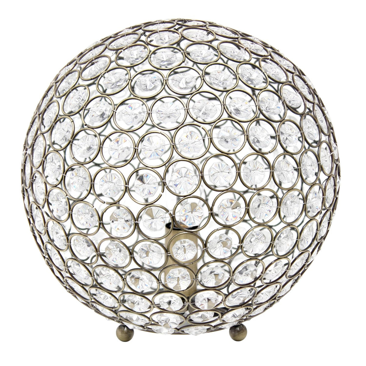This 10" sphere shaped table lamp is a designers dream with its gorgeous shimmering crystals surrounding the rounded metal frame. Available in a number of finish options ranging from a classic gold, to a modern chrome. With the turn of a gear (rotary) switch on the cord of the lamp, a rich glow shines through the crystals, leaving your space breathtakingly illuminated.Features:Material: Crystal, metalFinish: Antique brassFeatures a push pin on socket of the lamp for easy accessibilityRequires 1 x 40 watt equivalent type B10 candelabra based bulb (not included)Socket is secured with 2 x washers & wingnutAvailable in a variety of beautiful metal finishes.Includes 1 x metal frame in a flawless antique brass finish, with crystals throughoutUSB port for convenient nearby charging of electronic devices including your phone, tablet, handheld games, headphones smart watches and moreSpecifications:Product Dimensions: 10" H x 10" W x 10" DProduct Weight: 2.95 lbsCertifications and Listings: ULAssembly Required: None