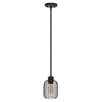 This industrial styled 1 light mini pendant is designed to compliment most décor types, while illuminating your space in style. This cage like fixture in all black brings an industrial influence mixed with a bit of a farmhouse style that allows ample amount of lighting to extend into your space. This lamp is ideal for hallways, entryways, bedrooms, and kitchens!Features:Material: MetalFinish: BlackRequires 4 x 60 watt equivalent type A19 E26 medium base bulbs (not included)Requires hardwiring and assemblyPart of Ironhouse lighting collectionIncludes 1 x black metal pendantFeatures black accents on socket holdersSpecifications:Product Dimensions: 53.25" H x 5" W x 5" DProduct Weight: 2.05 lbsProduct Dimensions: (Cage) 7" H x 5" W x 5" DAssembly Required: PartialCertifications and Listings: UL